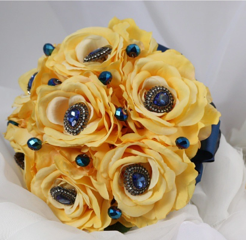 Beautiful decorative flower bouquet featuring yellow roses and blue accents. Perfect for adding a touch of elegance to any room or event. a great gift for different occasions or can be used as a wedding bouquet!