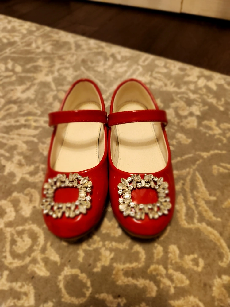 These adorable red dress shoes feature a lovely rhinestone embellishment. They show some signs of wear, as seen in the photos, but still have lots of life left in them! Perfect for a special occasion or dressing up any outfit