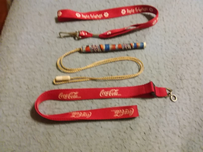 A collection of lanyards, including a Coca-Cola branded one and a 'best friends' lanyard, plus a decorative souvenir container and a small designer picture frame πππ No limit on asking for π items. Pickup today only until 9 pm.