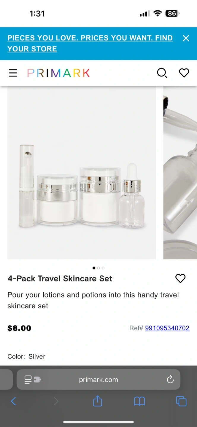 Selling a handy travel skincare set from Primark! This 4-pack is perfect for carrying your lotions and potions on the go. The set is silver in colour and was originally bought for $8 USD Selling for $11 each or 2 for $20 The two middle containers are the ones where you push the top and the product comes out, not an open jar.