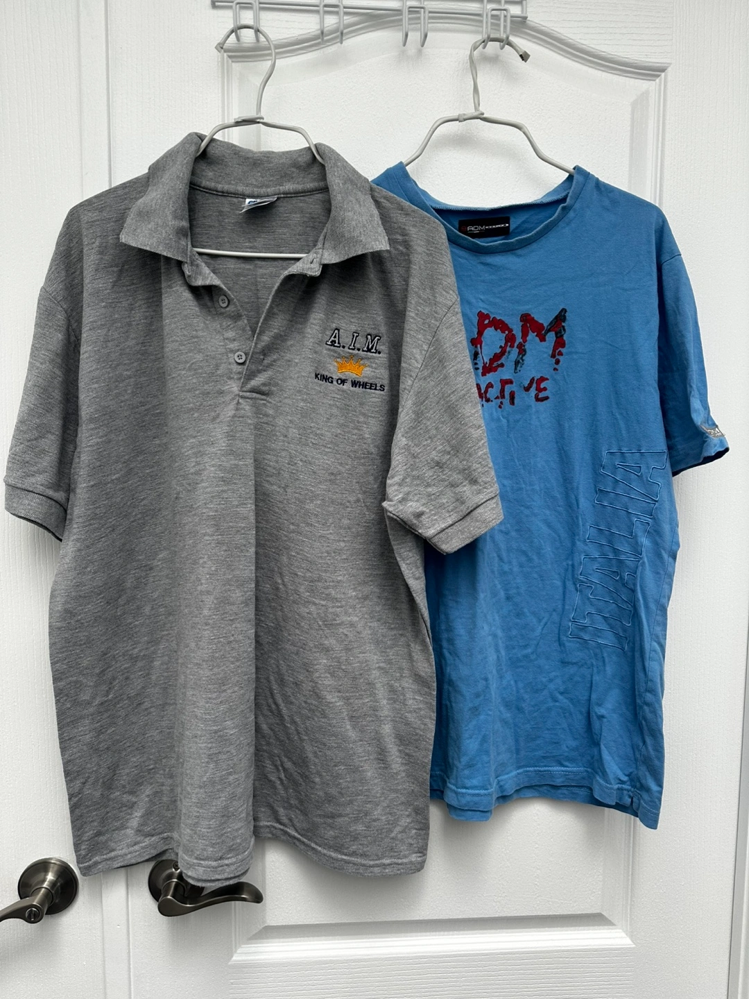 #Freecycle - two men's t-shirts together! One is a grey polo shirt with 'A.I.M. King of Wheels' on it, and the other is a blue tee with 'ADM ACTIVE' design. Both are in good condition and ready for a new home #Freecycle