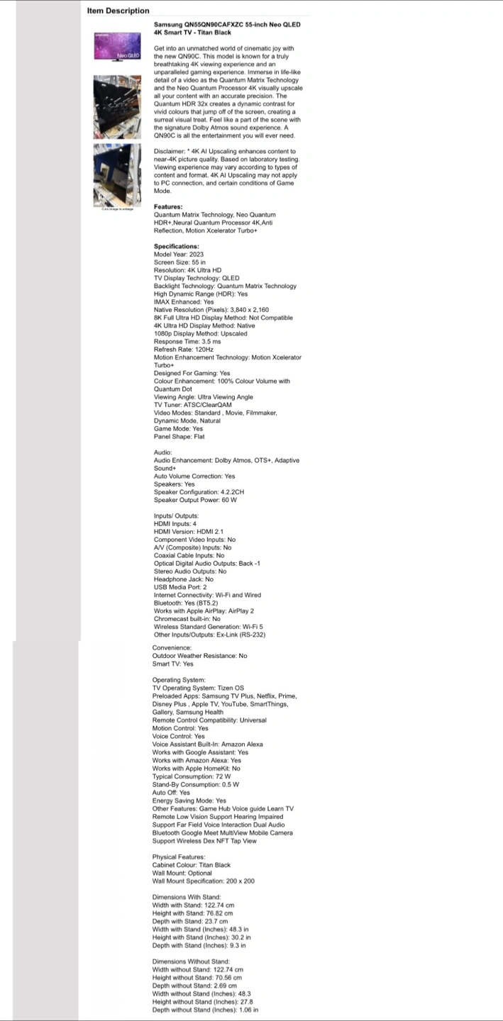 BEST OFFER or FIRST COME! (Offers below $700 will not get a response) NEW - Store Display unit! MSRP $1,599.99 + tax Items Included: Samsung QN55QN90CAFXZC Remote Power Cable Screws Stand neck Manuals Items Not Included: Stand Base Plate Specs: NEO QLED 4K Unit has been tested and is fully functional. Minor glue residue on back panel. OEM box not included. https://www.bestbuy.ca/en-ca/product/samsung-55-inch-neo-qled-4k-smart-tv-qn55qn90cafxzc-open-box-10-10/17361767 •••••••••••••••••••••••••••••••••••••••••••• Pay via Cash, Credit, e-transfer, crypto, Apple Pay, & MORE! **Delivery and Shipping is possible depending on location and small fee. Delivery and shipping fees must be paid in advance by you regardless of purchase** •••••••••••••••••••••••••••••••••••••••••••• Caveat emptor It is the duty of the buyer to inspect, test, and agree to our products prior to completing transaction. You accept full responsibility of the product the second money exchanges hands even if you choose to not test and inspect. If the unit is factory sealed and you decide to break the seal to inspect and test, you agree to complete the sale as long as the product inside is in adequate condition.