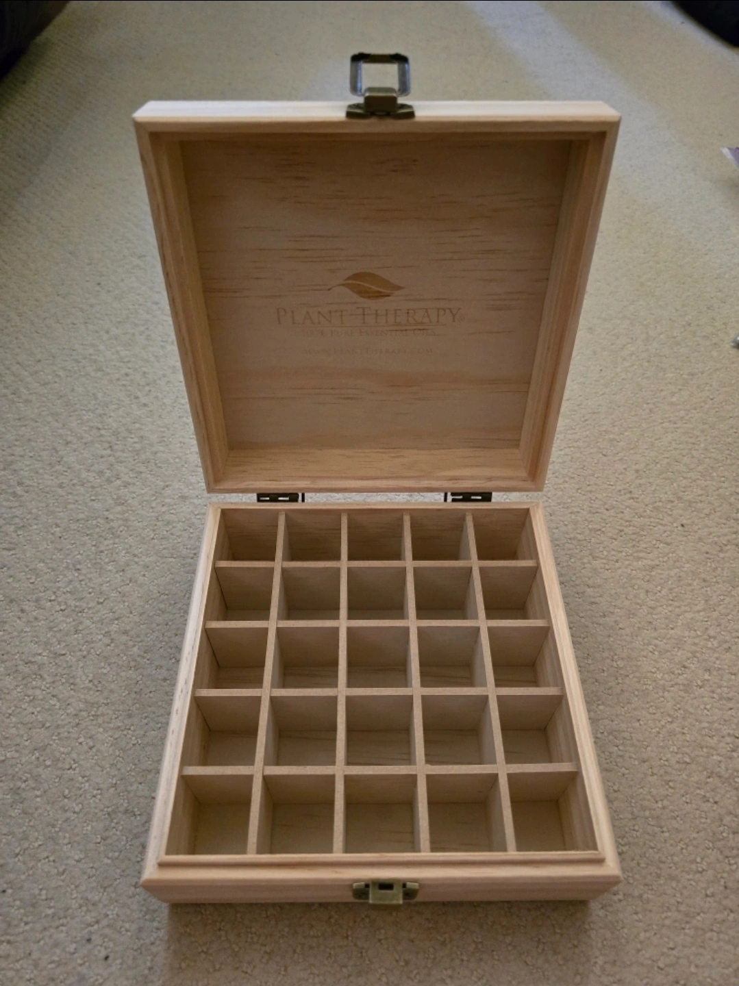 Brand new, never used. Wooden box with 25 compartments for storing essential oils. Has a latch to keep the lid closed. Box weight is very light. Box is 7" x 7" x 3" Each cell is 3 cm x 3 cm