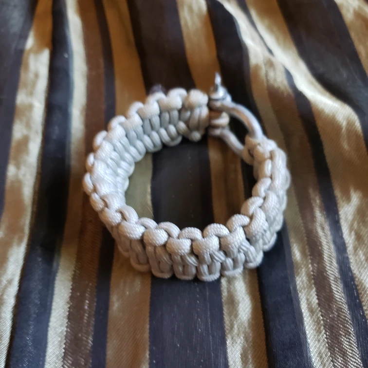 Selling a handmade paracord bracelet. It's a stylish and durable accessory, perfect for everyday wear. The bracelet is a neutral grey colour and features a unique woven design.