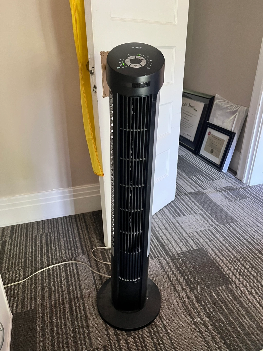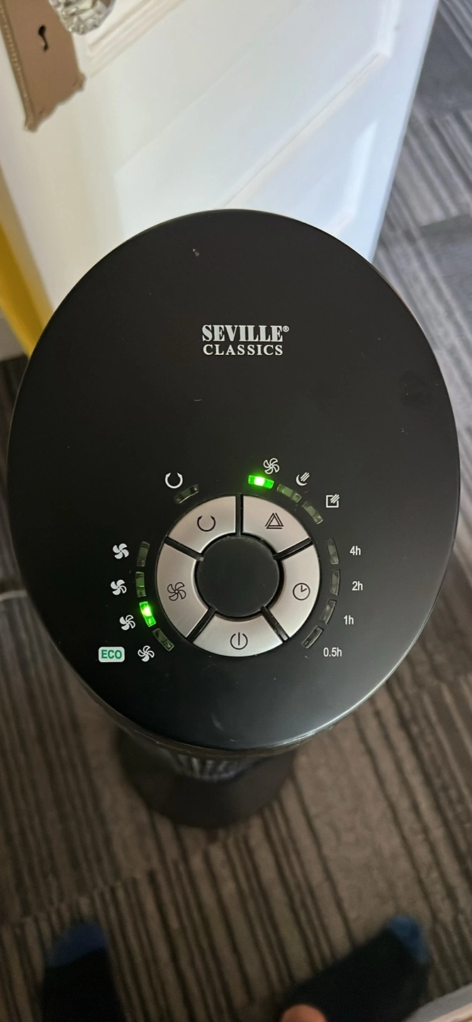 Selling a Seville Classics tower fan in black! It's in great condition and ready to keep you cool. It features multiple speed settings, a timer, and an ECO mode for energy saving. Perfect for any room! About 1 metre tall