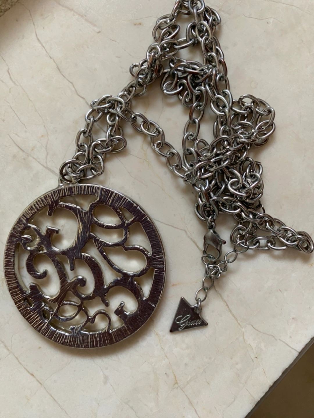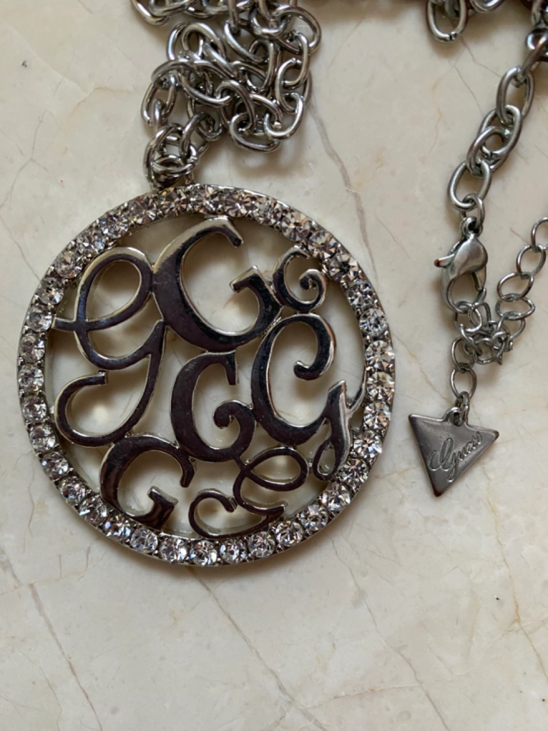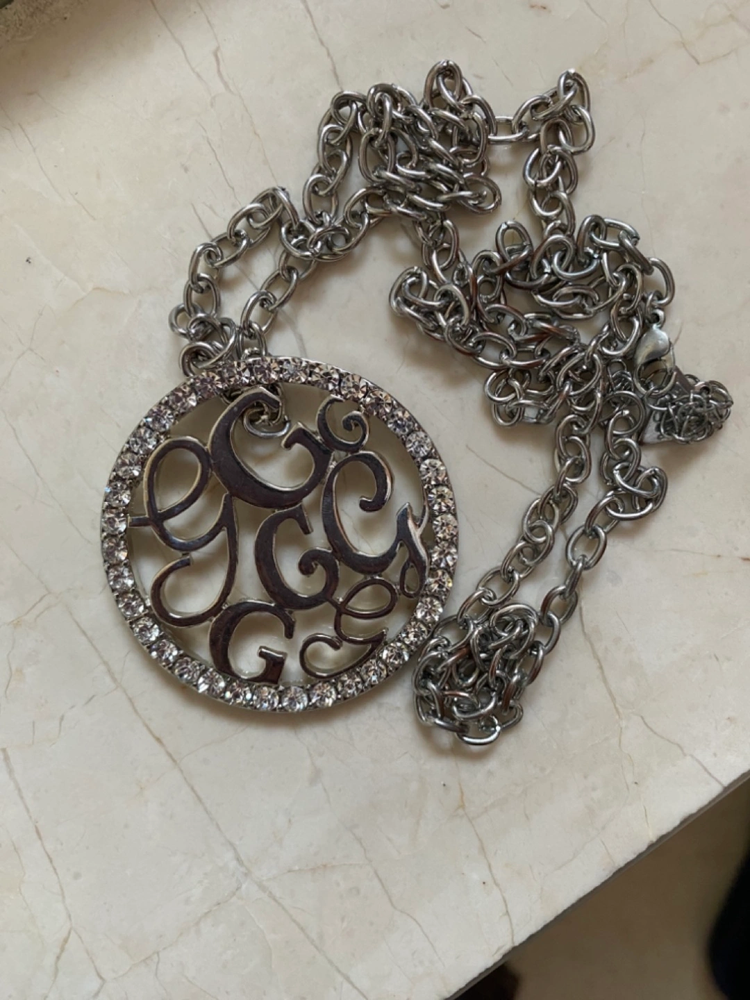 Guess silver-tone necklace. It features a large round pendant with the Guess logo and rhinestone accents. The chain is a classic link style with a small Guess charm near the clasp. Excellent Condition Cash Only
