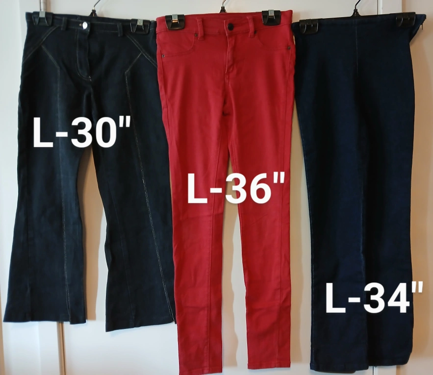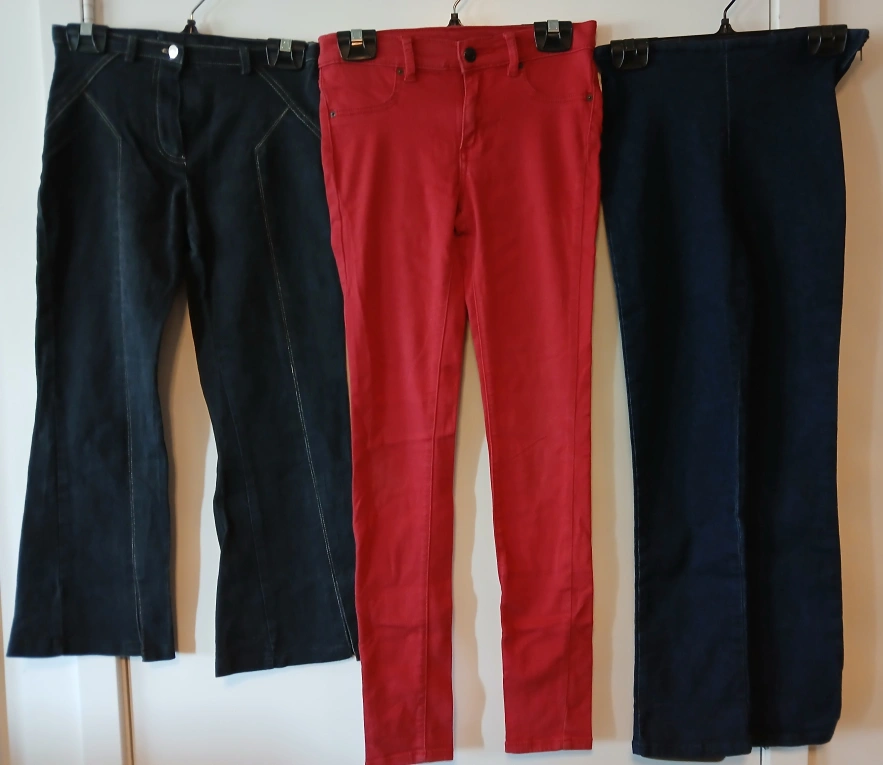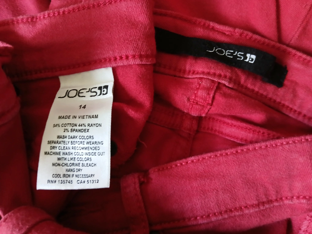 *Cash and pick up ONLY at location shown on ad. Selling a collection of women's jeans. Waist is 25" on all 3 pairs. - One pair is a dark wash with a unique design. - A red pair from Joe's Jeans, size 14, made of 54% cotton, 44% rayon, and 2% spandex. - Another pair in a dark wash.