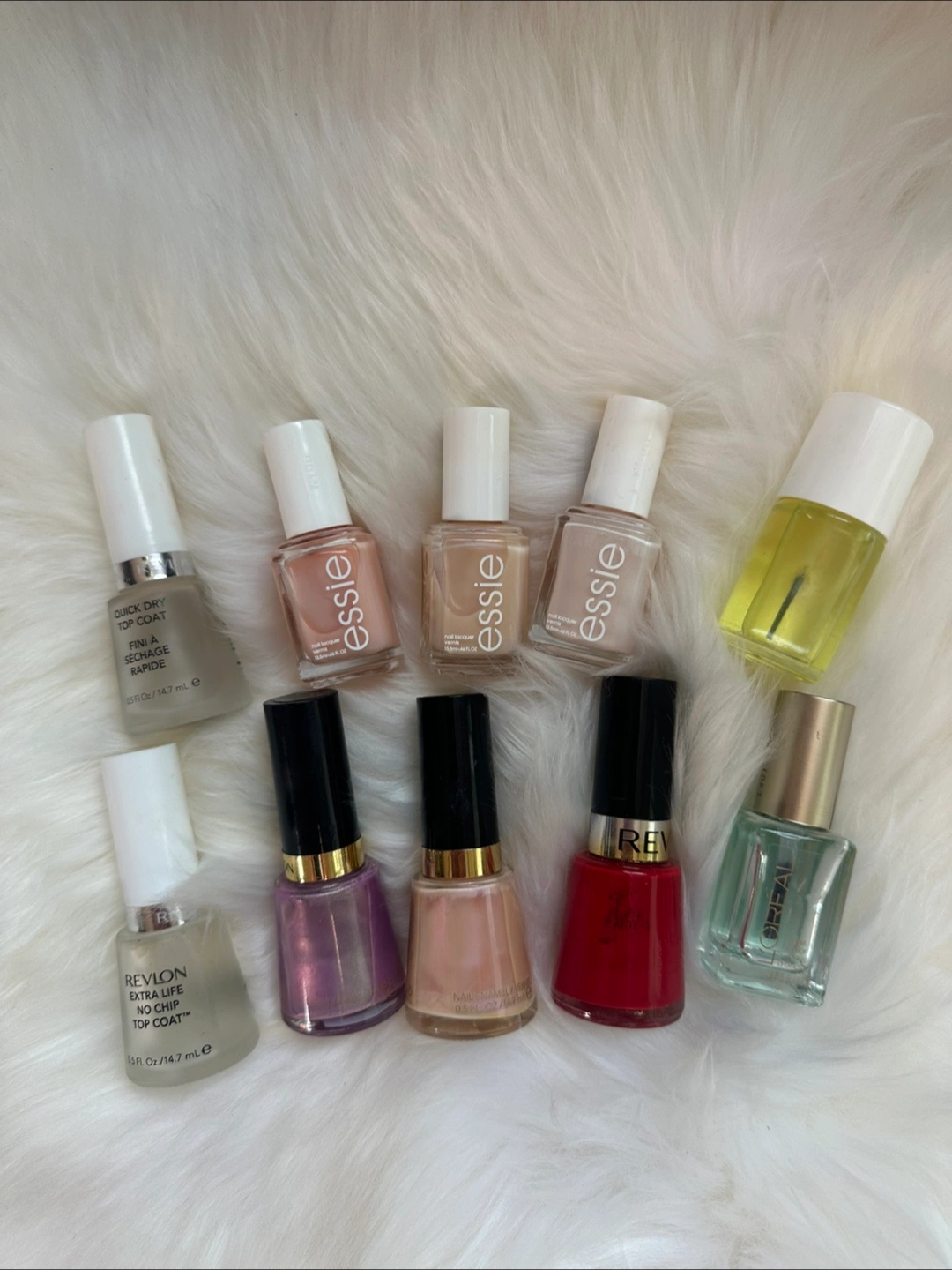 A variety of Essie and Revlon nail polishes in various quantities. Also includes base coat, top coat, and cuticle oil. Available for pick-up in Pickerinng (Brock & 401).