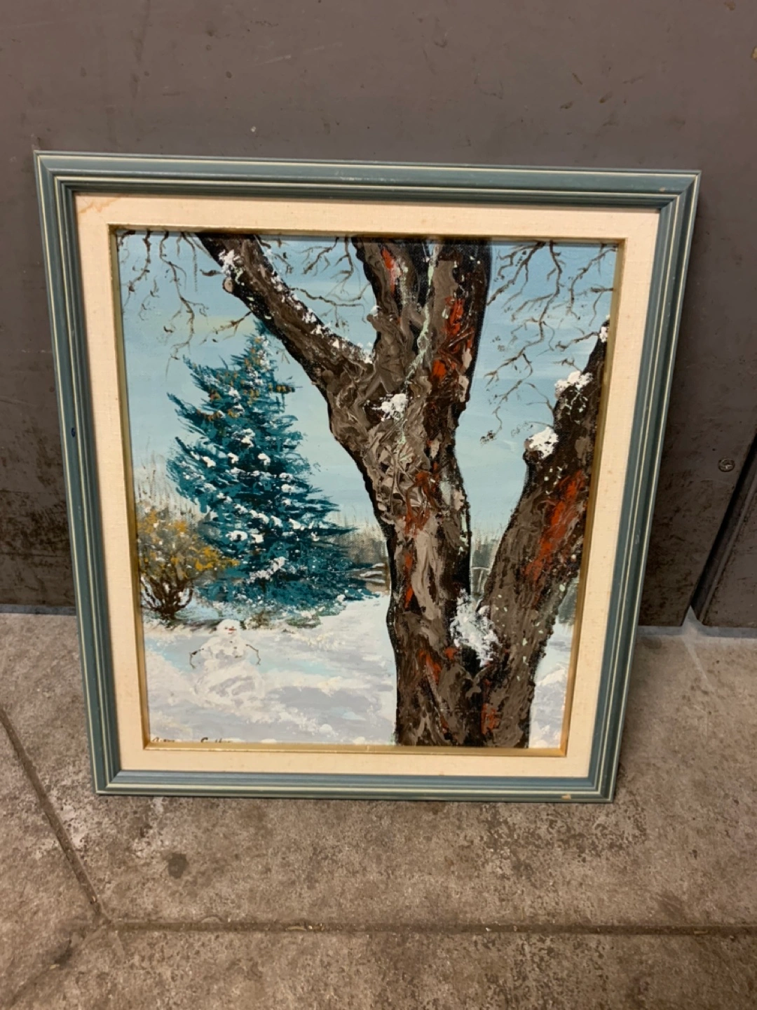 Selling a vintage framed painting of a winter scene with trees. It's a lovely piece of art! Unfortunately, the bloody frame was put on wrong a long time ago obstructing the artist signature…
