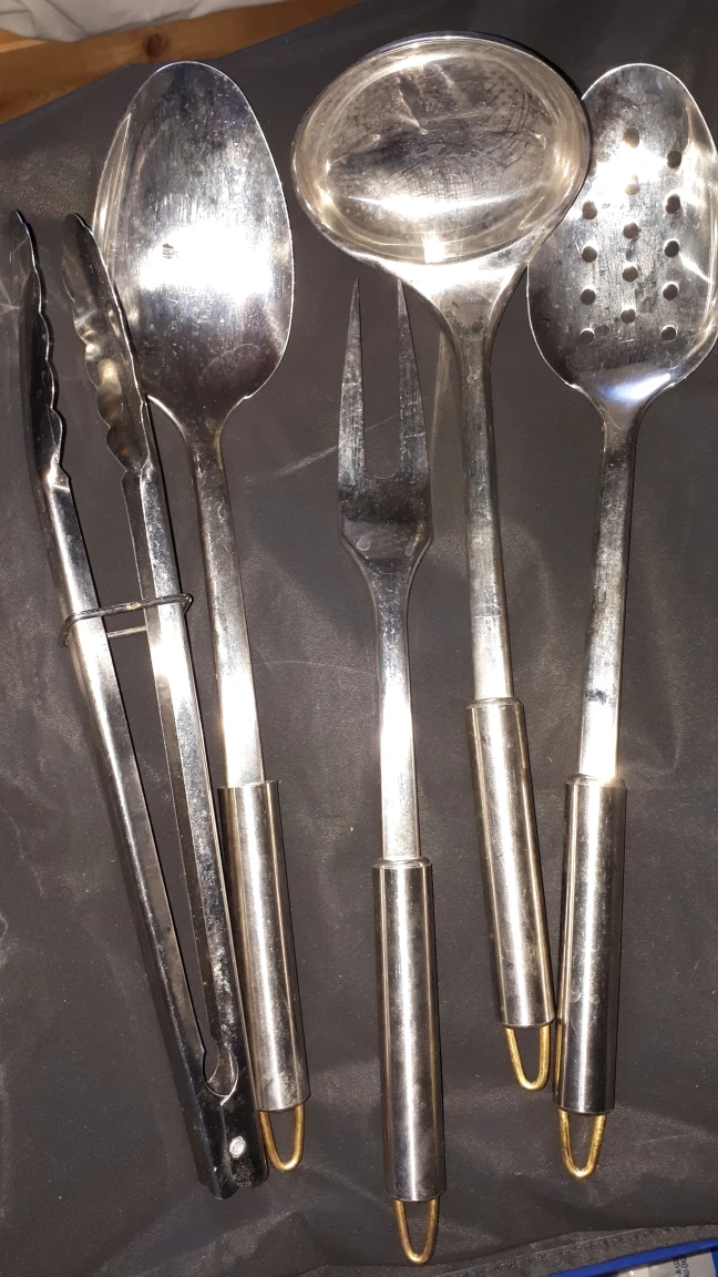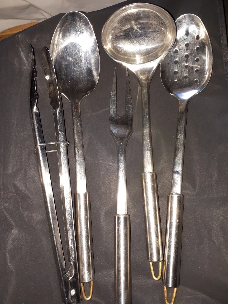 Selling a set of stainless steel kitchen utensils! Includes tongs, a large spoon, a ladle, a fork, and a slotted spoon. Perfect for cooking and serving!