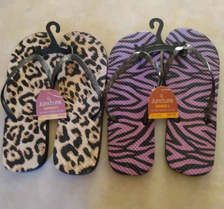Two pairs of women's flip flops available! One pair is a fun leopard print and the other is a cool purple and black zebra print in size M. Great for Summer ποΈπ