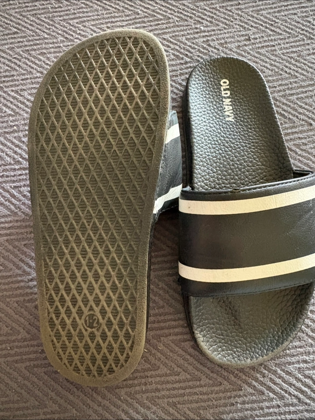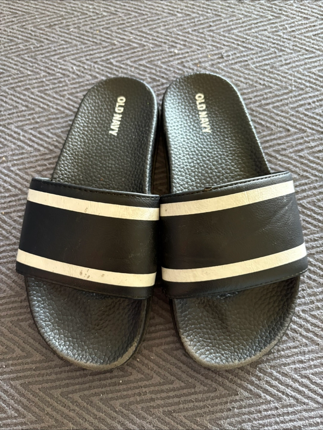 Selling a pair of Old Navy slides in black with a white stripe. They are size 1-2. Good for casual wear!