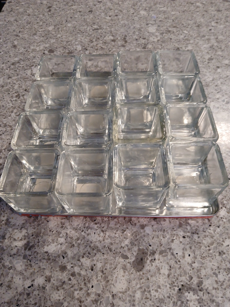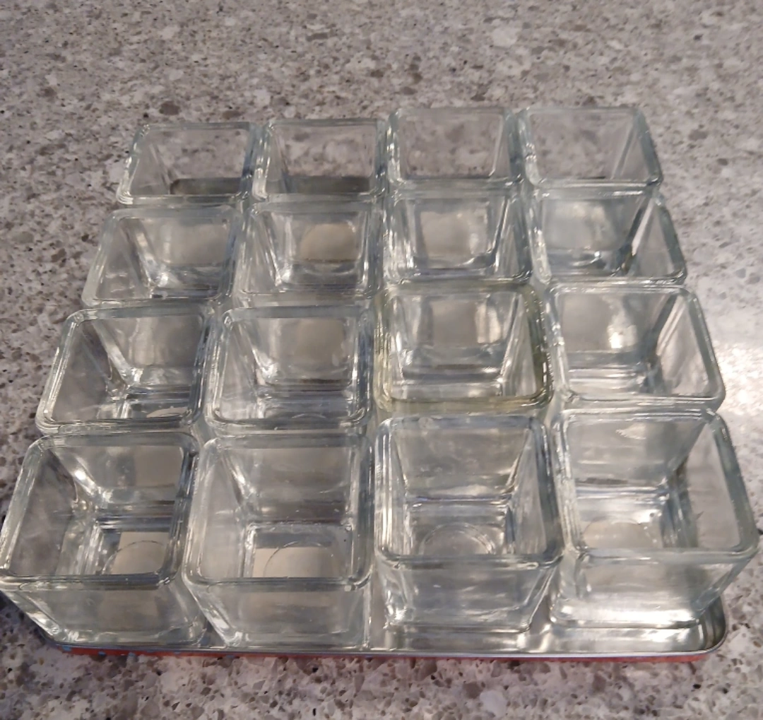 *Cash and pick up ONLY at location shown on ad. *No trades. Non-negotiable. ✅️Set of 16 glass votive candle holders. Measures 2" sq × 2" h. Comes in a tin box. Sf/pf home.