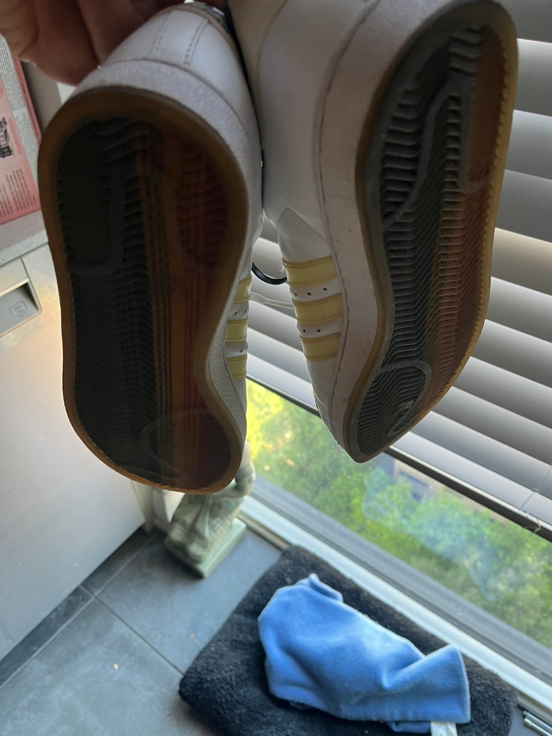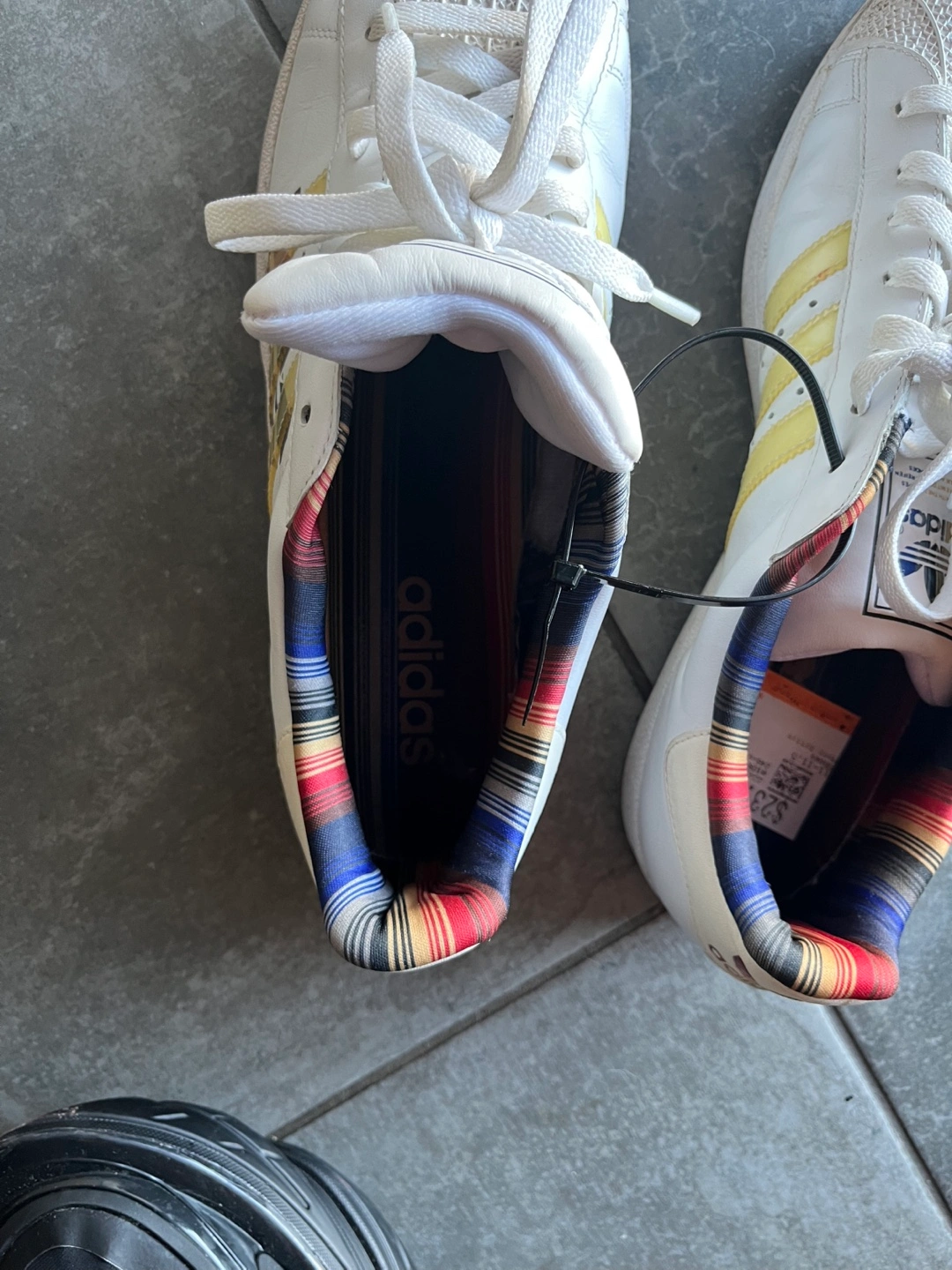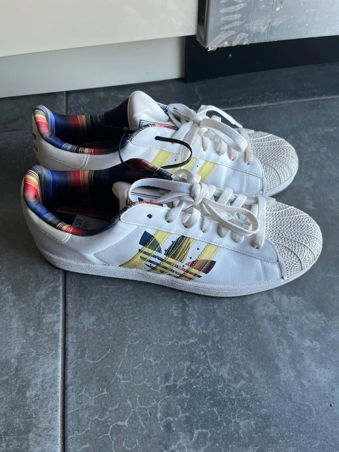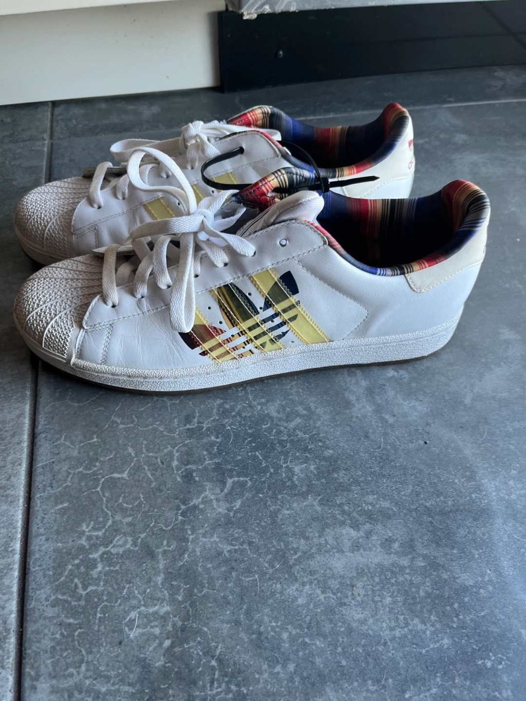 Selling a pair of Adidas Superstar sneakers in white! New. Limited edition. The size is US 11.5. They feature a cool plaid design on the inside and on the stripes You can pick up by Carlton and Jarvis area
