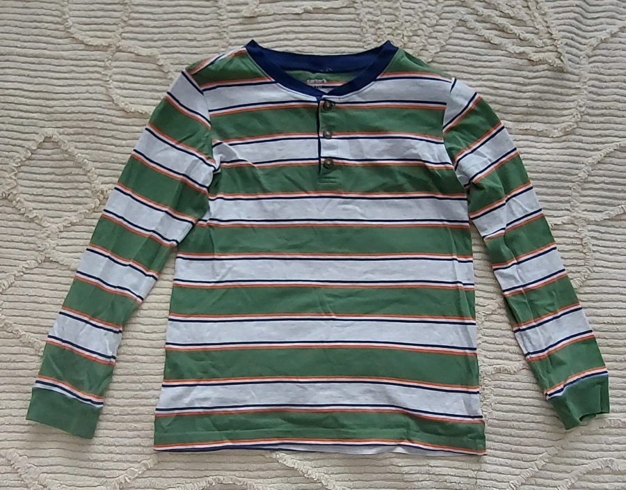 Here's a Carter's Kid long-sleeve shirt in size 8! It features green, white, and orange stripes, perfect for layering or wearing on its own. It's in great condition and ready for a new home BUNDLE UP AND SAVE! Pick up only Pet free and smoke free household Yonge and Eglinton area Only cash payment