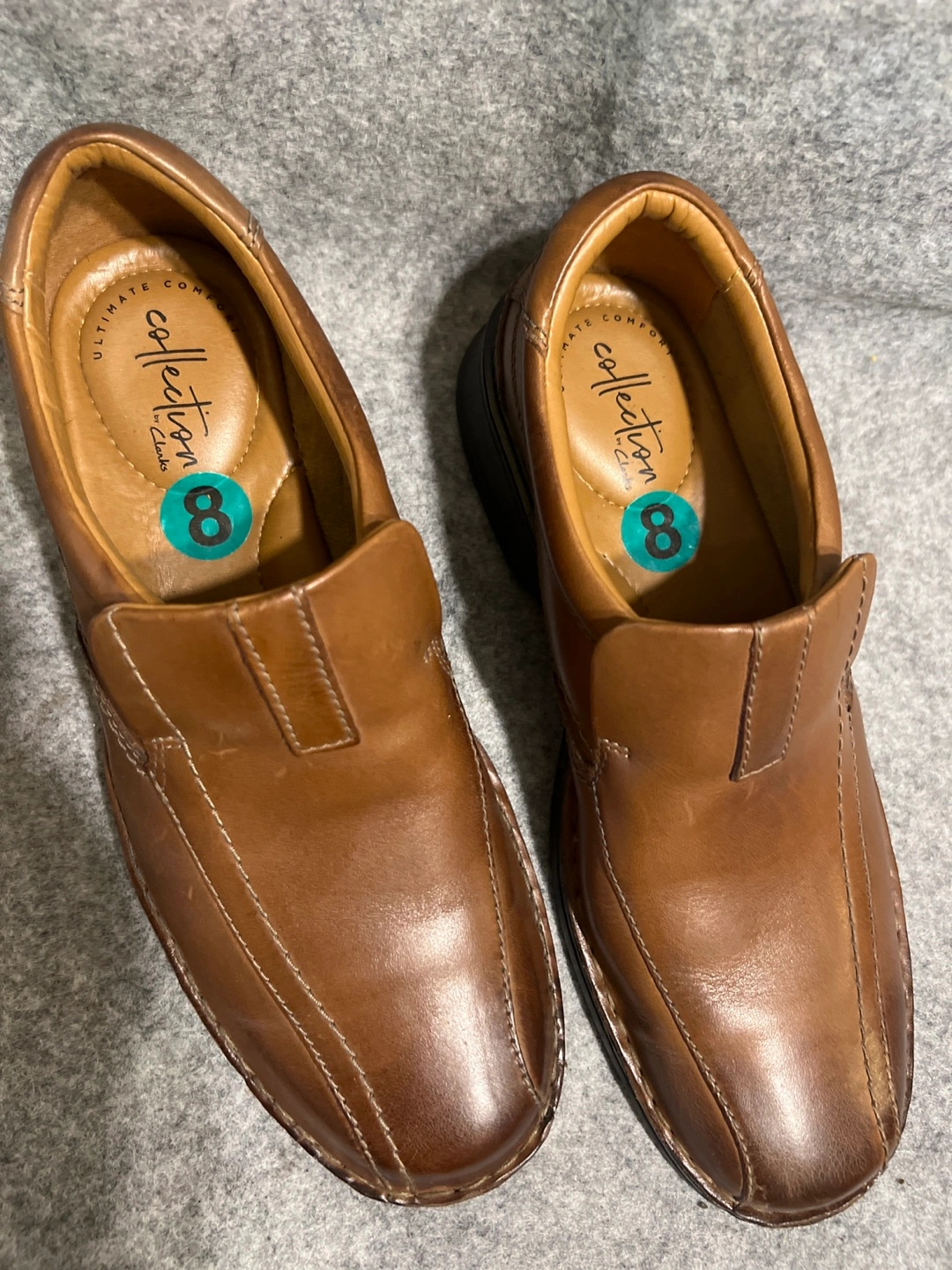 Brand New. Selling a pair of Clarks Collection men's loafers in brown leather. They're a size 8. A stylish and comfortable choice!