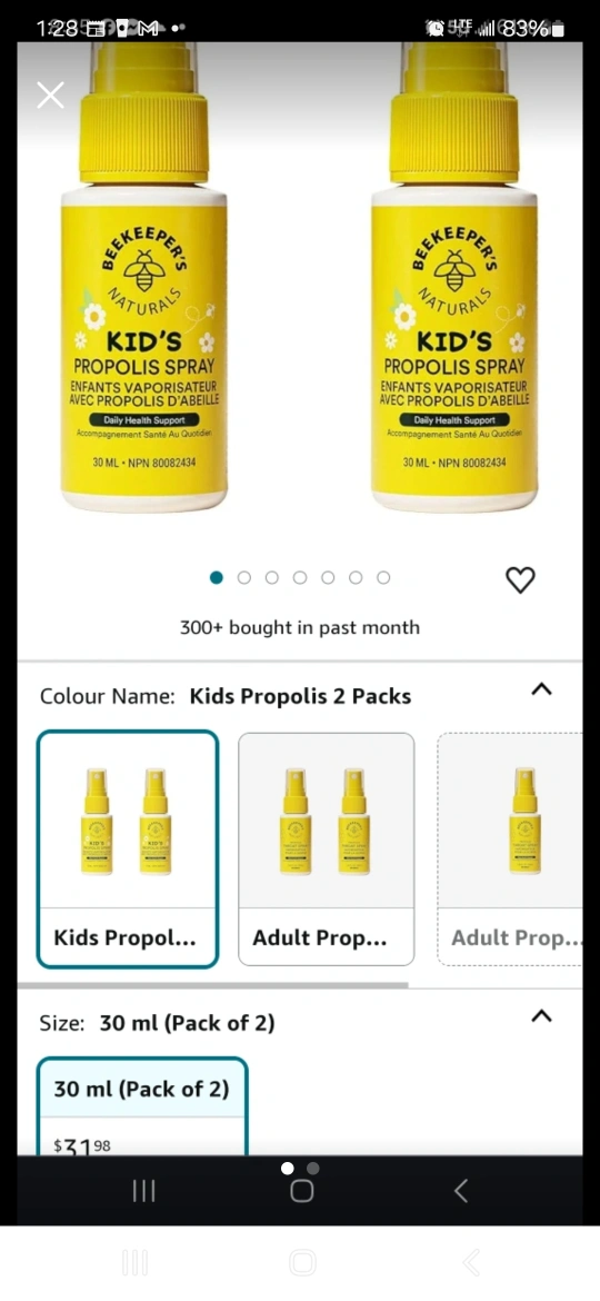 A pack of two 30 mL bottles of Beekeeper's Naturals Kid's Propolis Spray. Adults can use as well. New Sealed Best before date October 2026