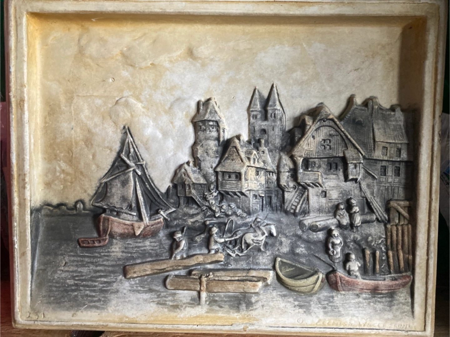 This vintage plaster wall art (12” x 9”) piece depicts a charming coastal village. It's a unique and detailed piece that would add character to any room.