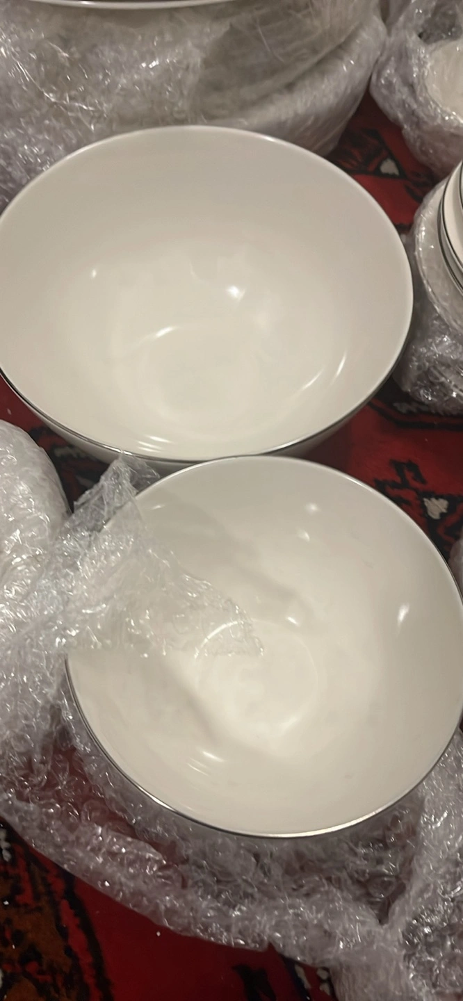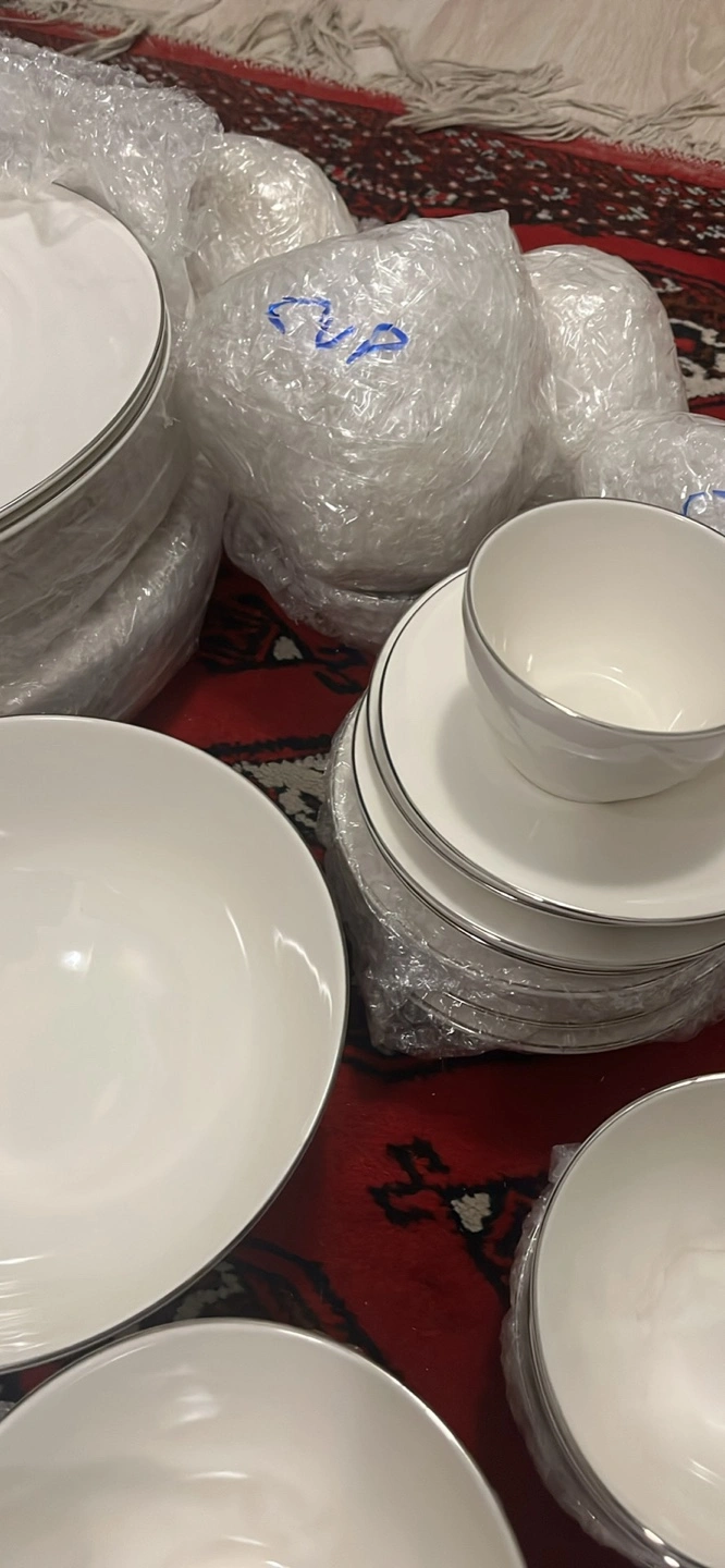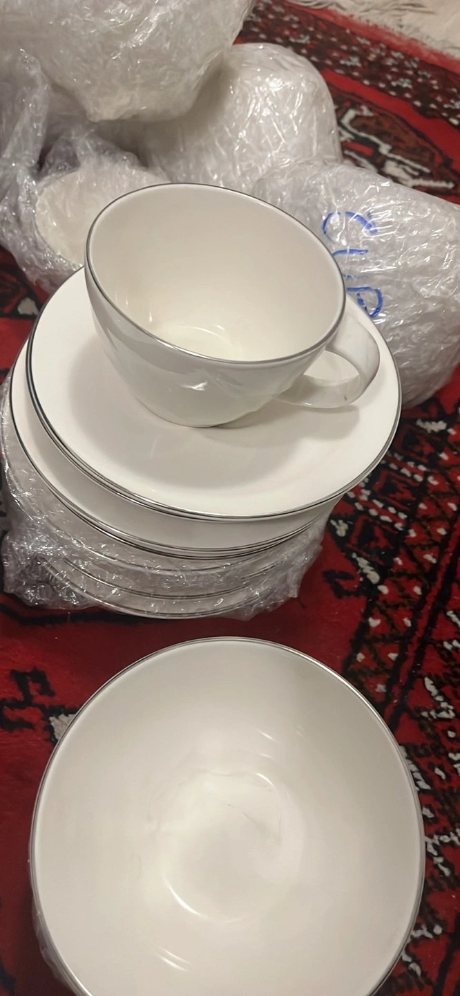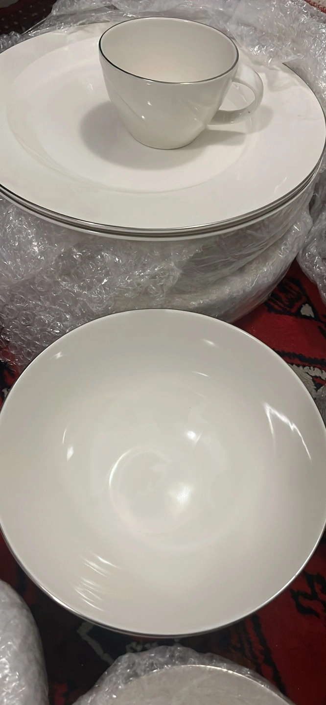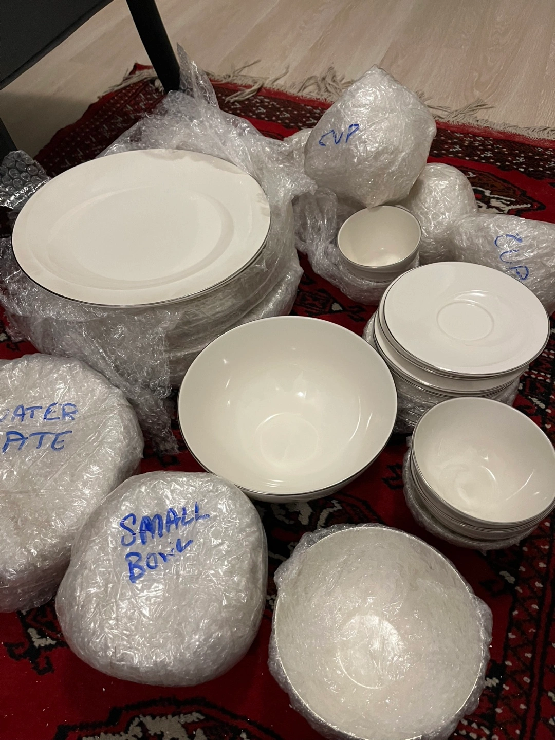 Selling a set of white dinnerware, including plates, bowls, and cups. They are in great condition and ready to use for your next dinner party or everyday meals. The set includes large plates, small bowls, and cups. Everything is carefully wrapped!
