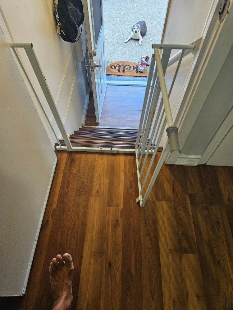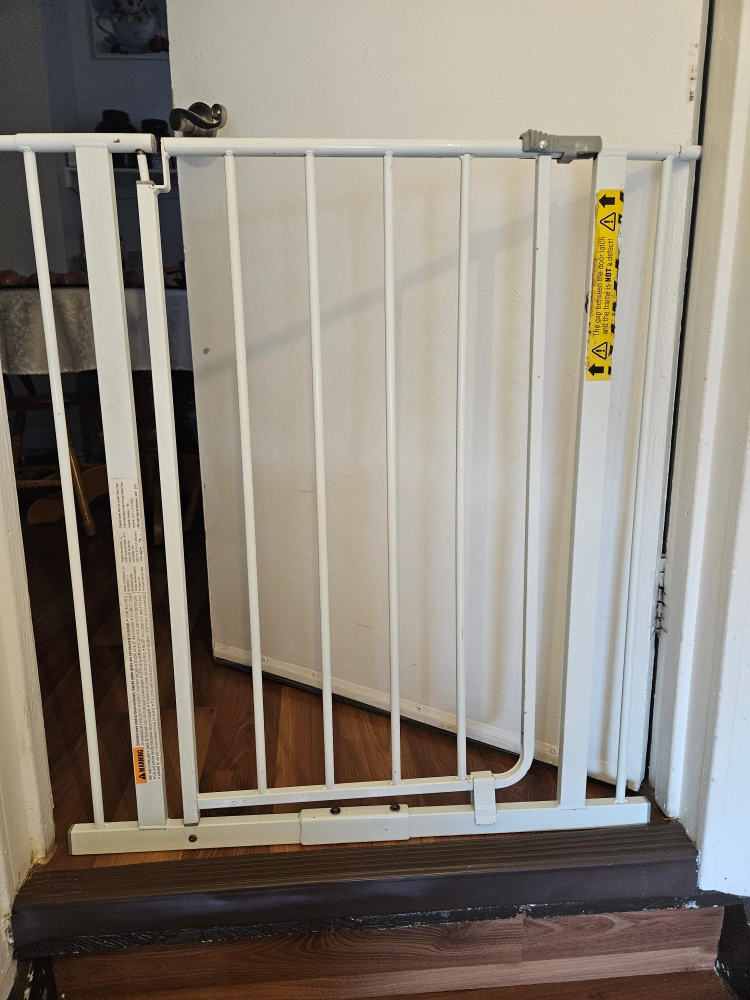 Selling a white expandable baby gate. It's in great condition and ready to keep your little one safe! Perfect for doorways or stairs