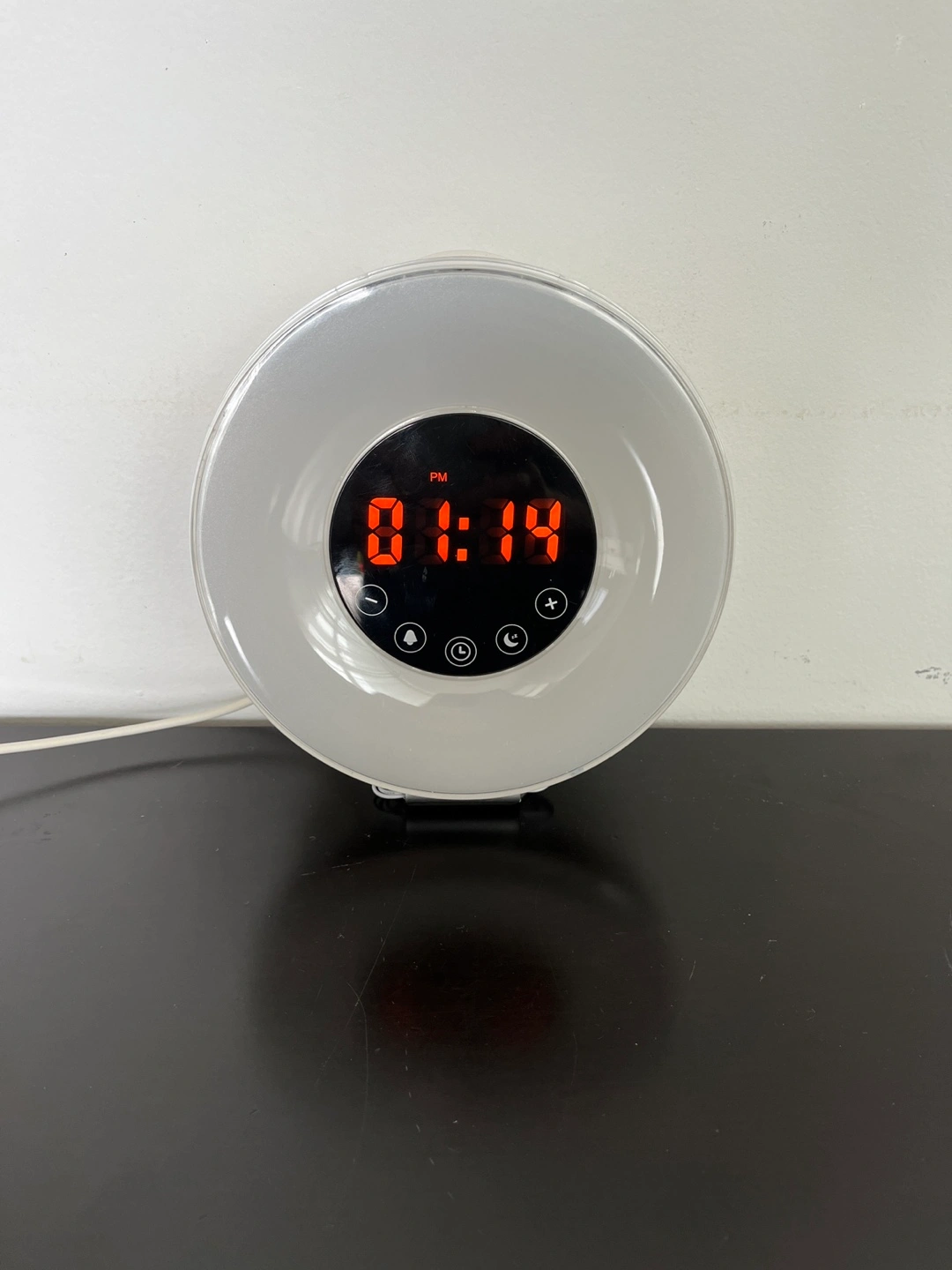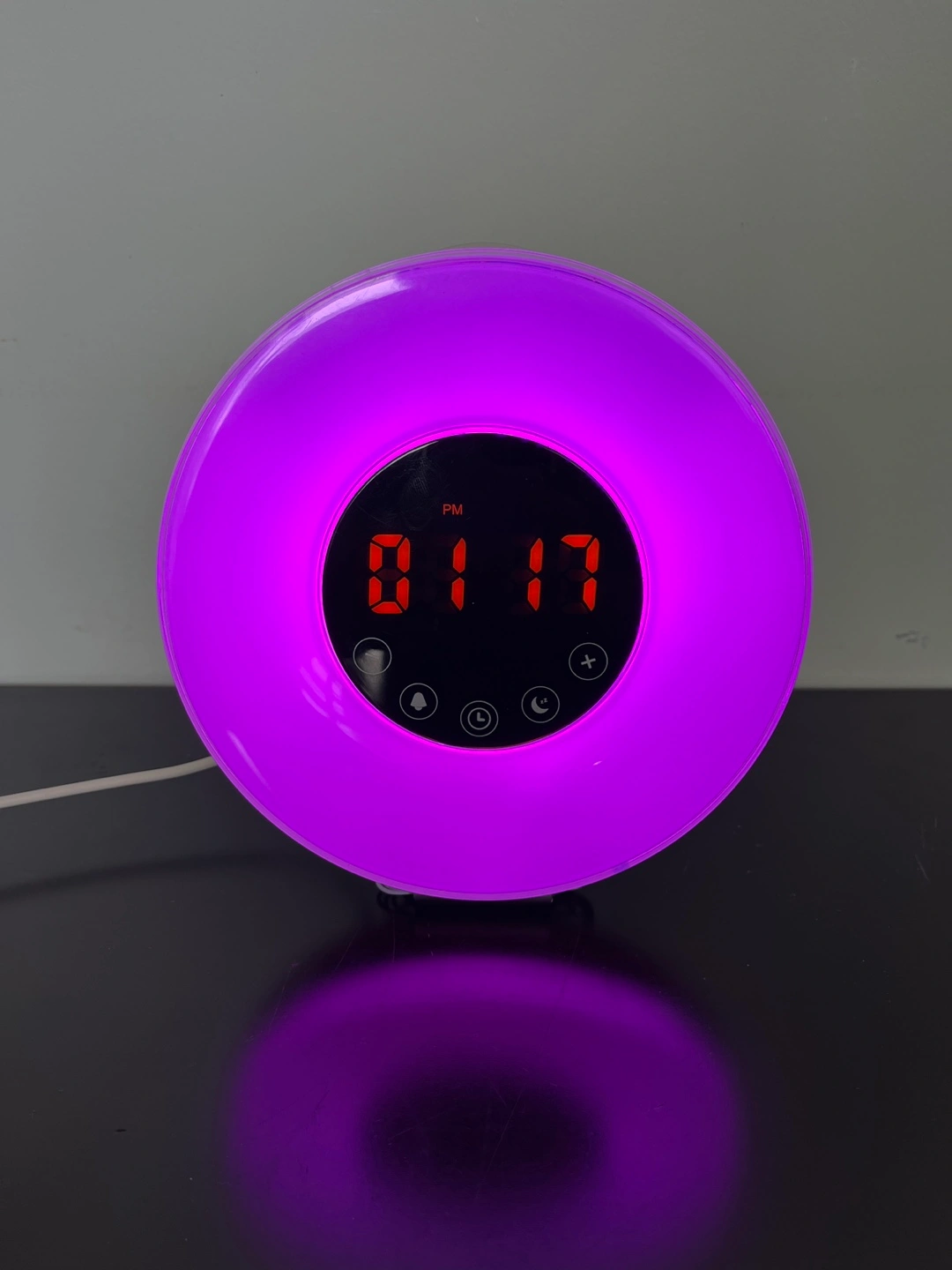Alarmclock with wakeup light, moodlight & natural sounds Wake up by natural sounds. LED display with dimmer. Gentle wake up lamp 30 mins before alarm time. Energy saving super bright LED light with brightness control. Mood light. Snooze function: (5 mins). Sleep function: (Up to 60 mins before sleep time).