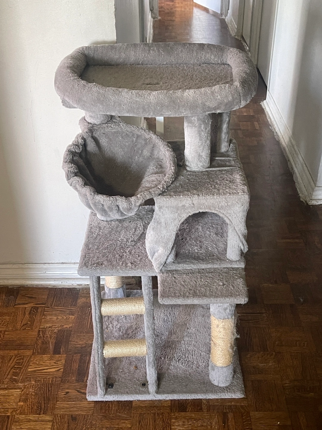 Selling a cat tree/condo. It's in great shape and ready for a new feline friend! It features multiple levels for your cat to explore, play, and relax. There's a cozy basket, a lookout platform, and scratching posts wrapped in durable rope. Perfect for keeping your kitty entertained and off your furniture!