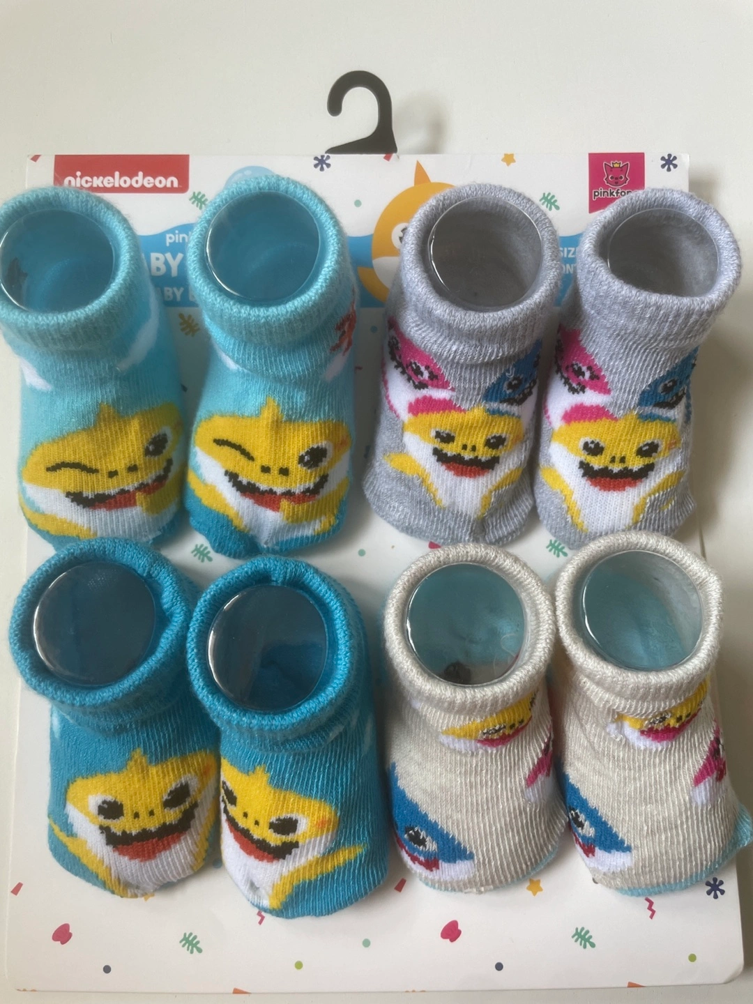 These adorable Baby Shark booties from Nickelodeon are perfect for your little one! They come in a pack of 4 pairs, sized for 18-24 months. Super cute and ready to keep those tiny feet warm!