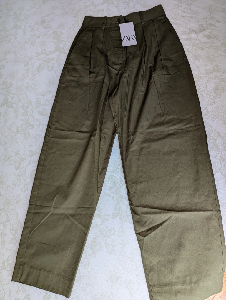 These are a brand new pair of Zara wide leg pants in a lovely olive green colour! They're a size XS and still have the tags on. Originally bought for $59.90, these pants are ready for a new home!