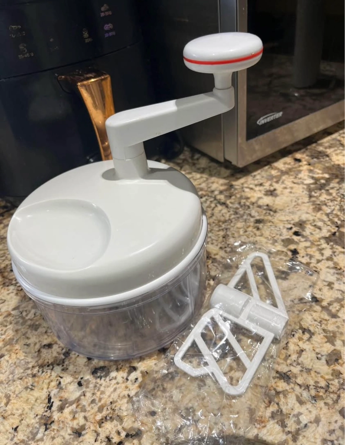 I'm selling a manual food chopper. It comes with the original blade and an extra blade attachment. It's perfect for chopping vegetables and herbs quickly and easily!