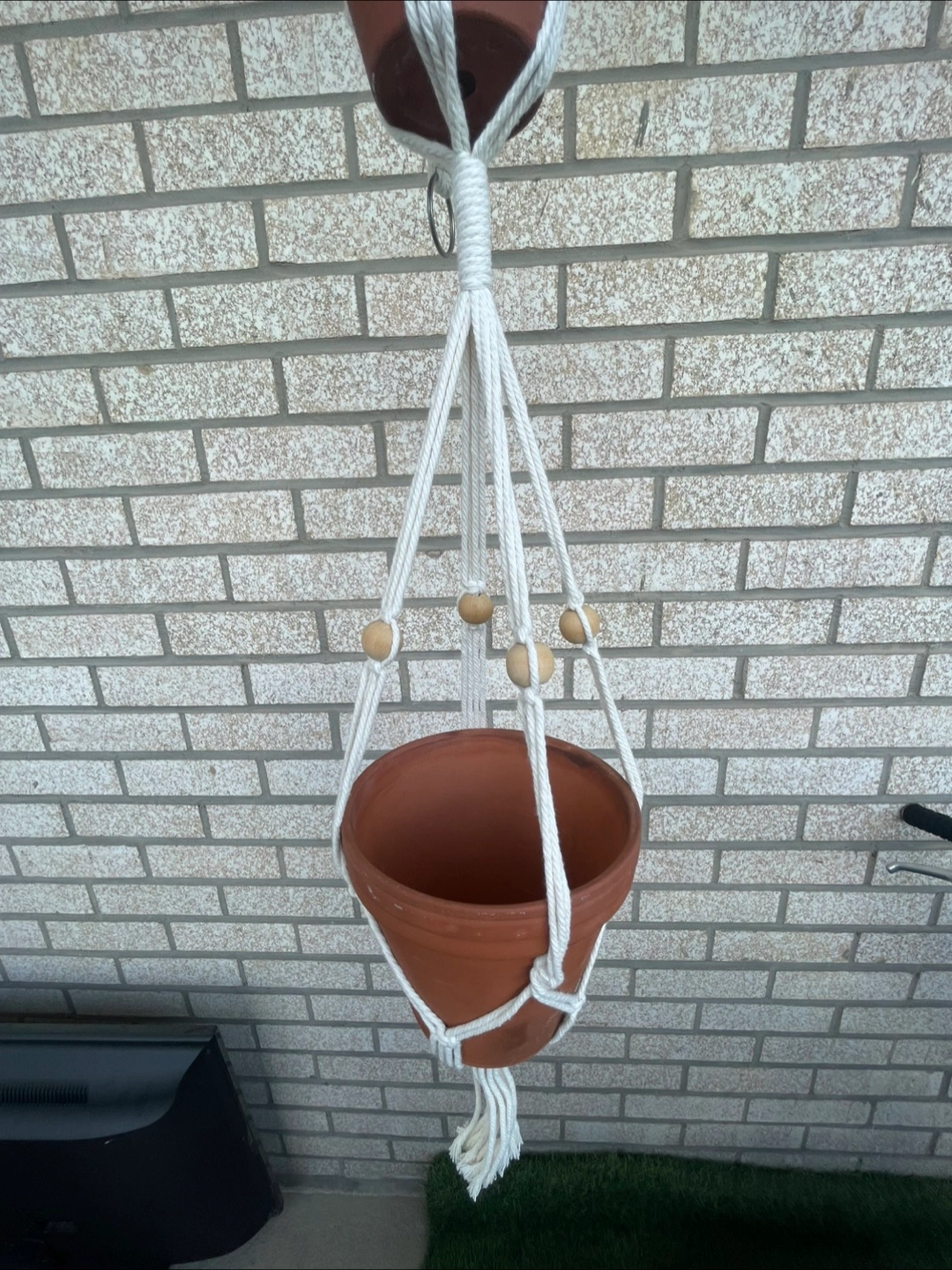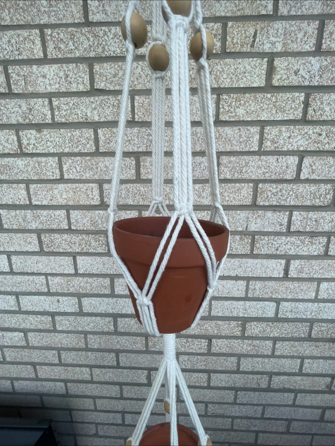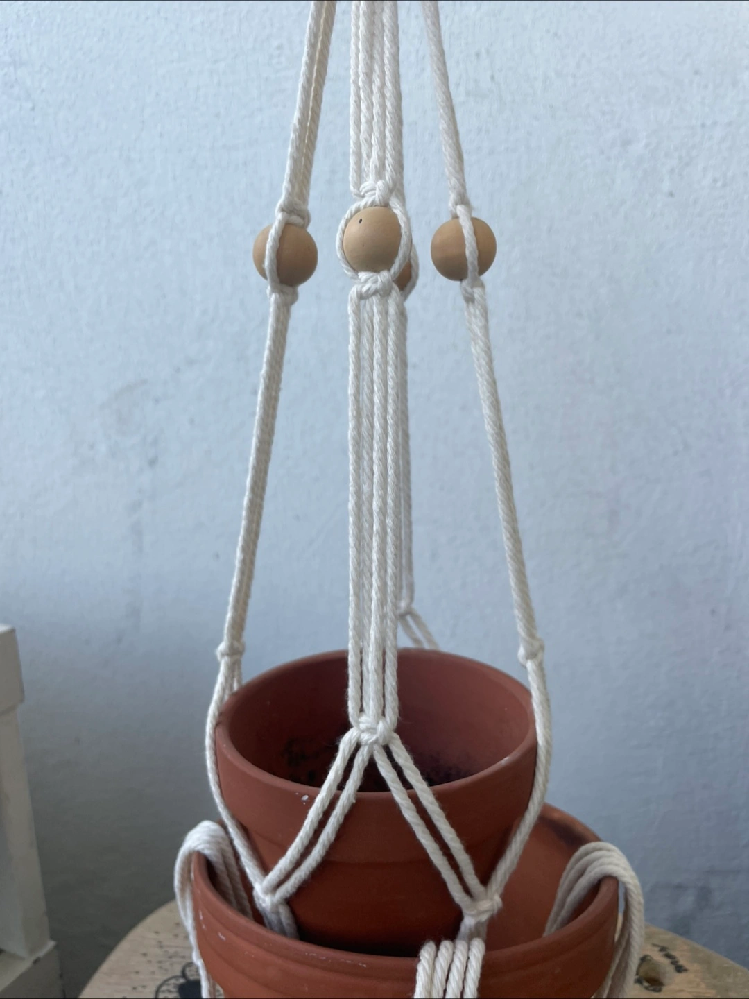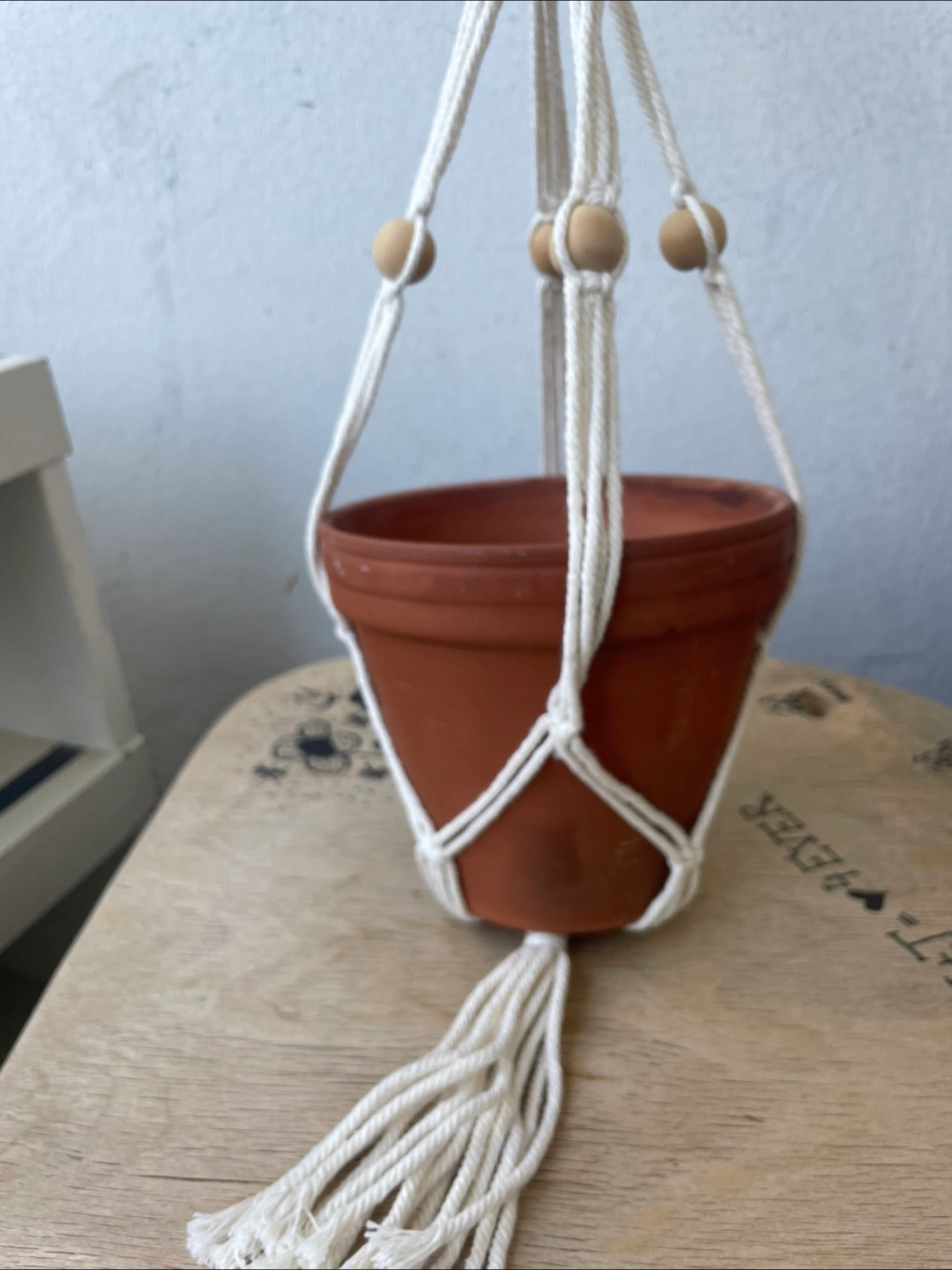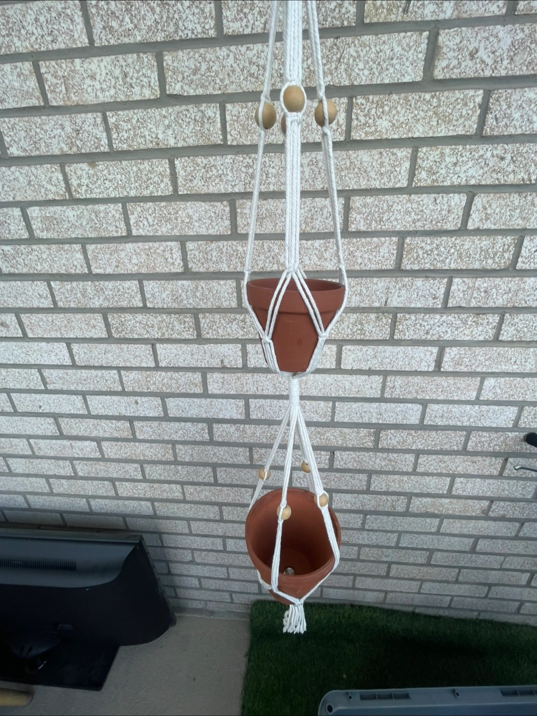 Here's a charming macrame plant hanger, perfect for adding a touch of boho style to your home or balcony! It comes with a couple of terra cotta clay pots, ready for your favourite plants.