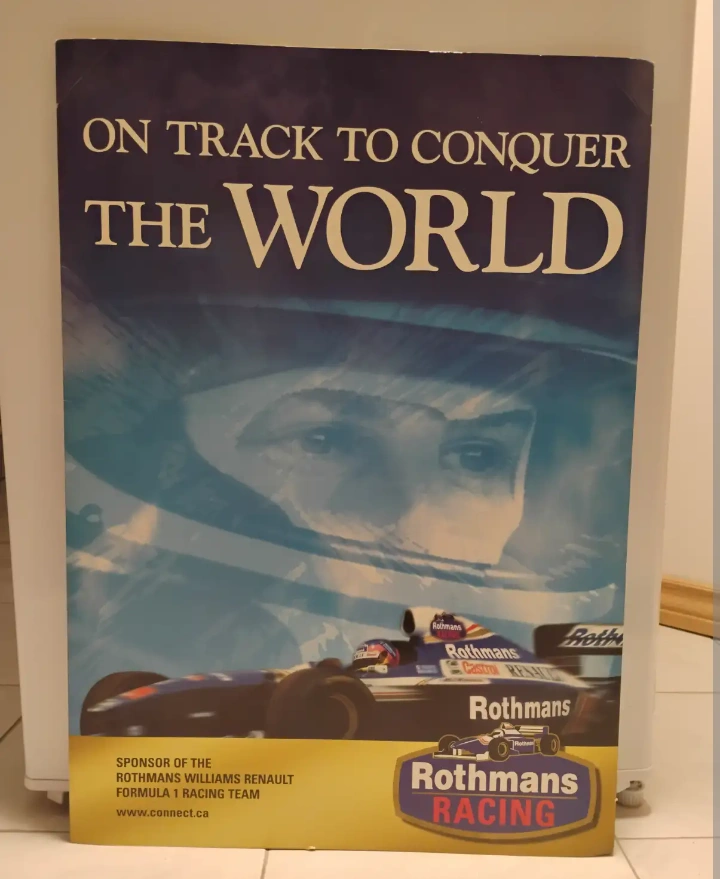 Selling an extremely rare and hard to find Williams/Rothmans Racing “On Track to Conquer the World” Window Display. Meant for convenience store. This is a beautiful double sided item measuring approximately 18.75 inches wide and 26.5 inches tall Asking $200 Meet-Ups at Cloverdale Mall (Etobicoke-[Toronto], ON)- Dundas/427