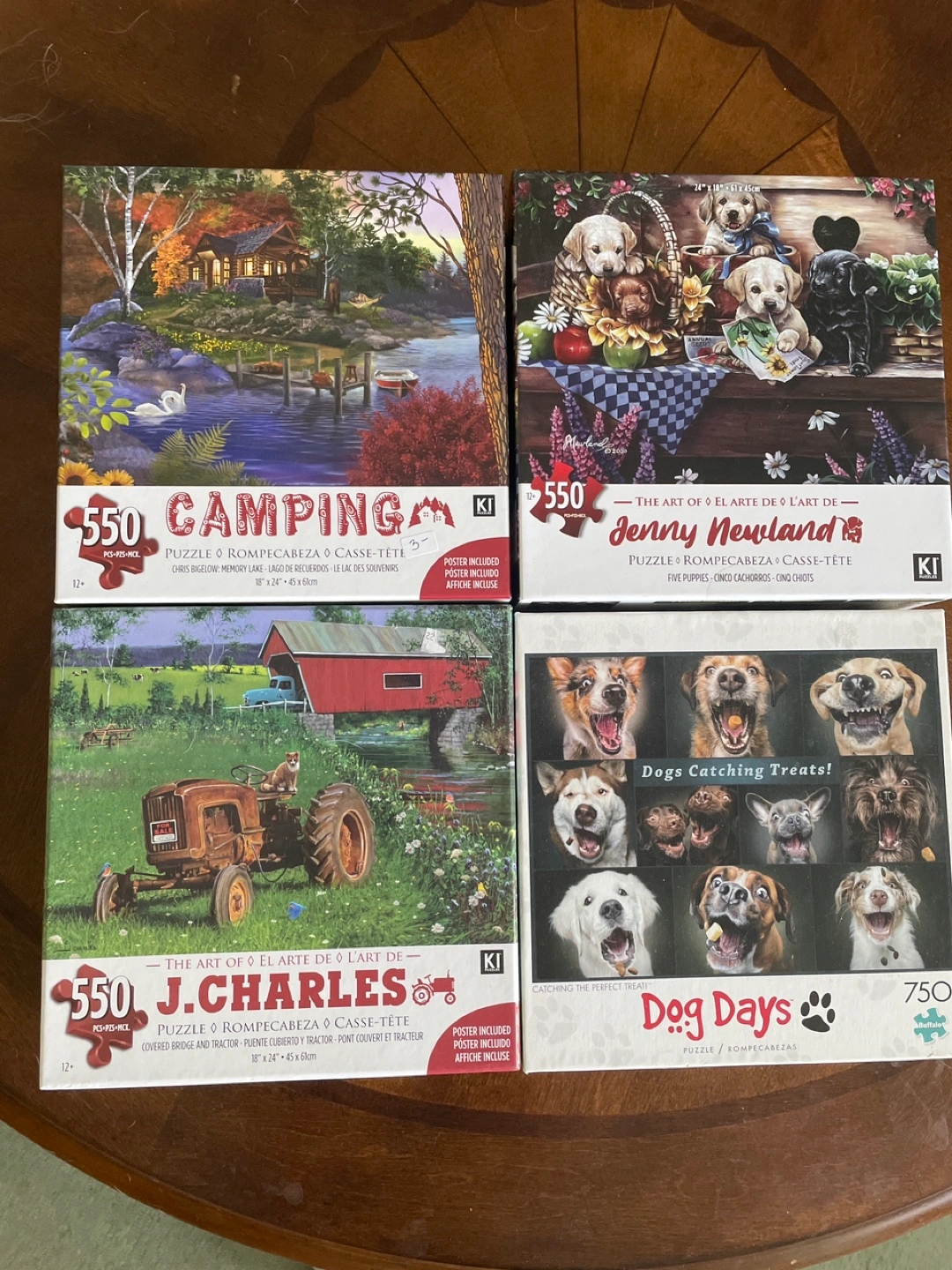 Selling four KI puzzles! 🇨🇦 - Camping: 550 pieces, Chris Bigelow, Memory Lake, 18" x 24" - Jenny Newland: 550 pieces, Five Puppies, 24" x 18" - J.Charles: 550 pieces, Covered Bridge and Tractor, 18" x 24" - Dog Days: 750 pieces, Dogs Catching Treats! $5 for all of them Pick up only