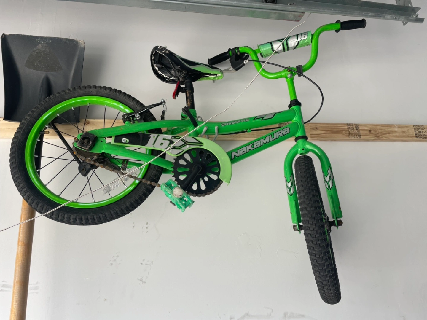 Selling a Nakamura Crassfire kids' bike in green! It's a 16-inch bike, perfect for young riders ready to cruise around the neighbourhood or hit the park. Great for learning to ride!Back tire need to change