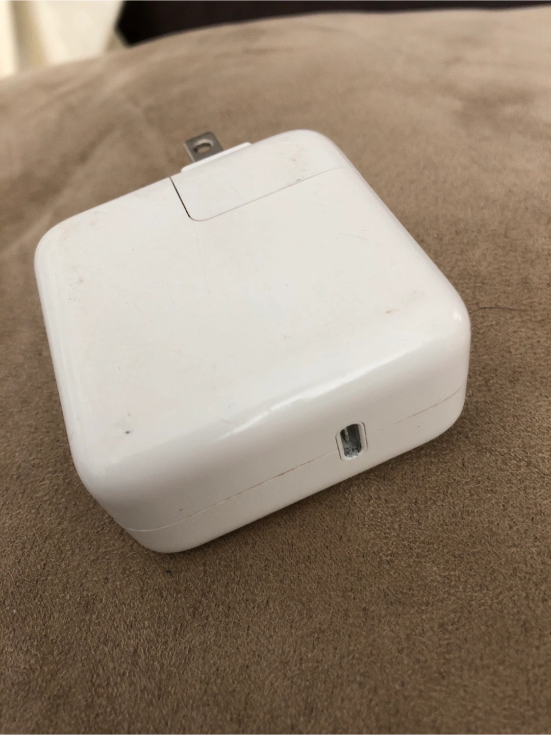 Selling an Apple charger in used condition. It has some visible wear and scratches. Marked with faint initials (faded sharpie). No charging cable.
