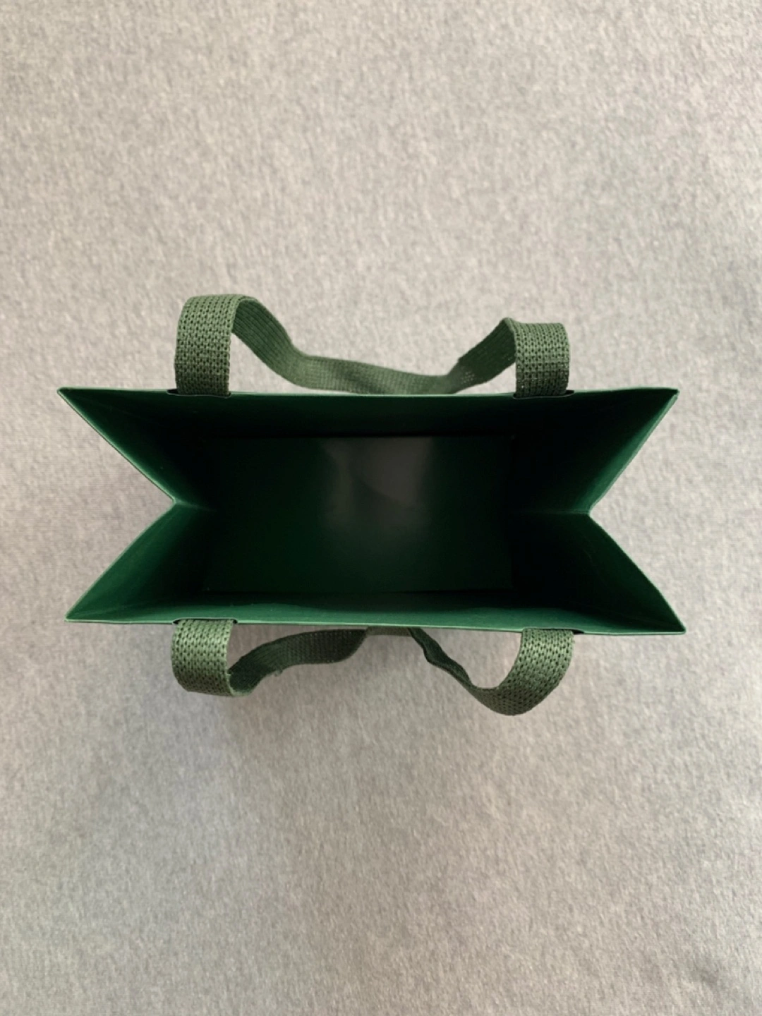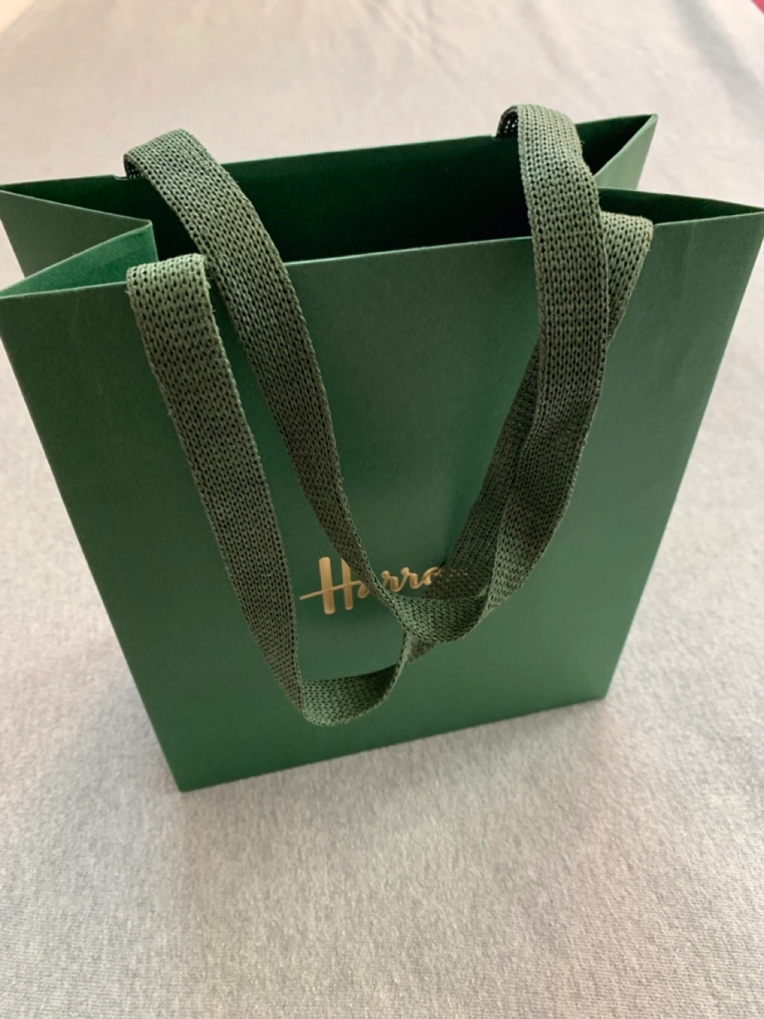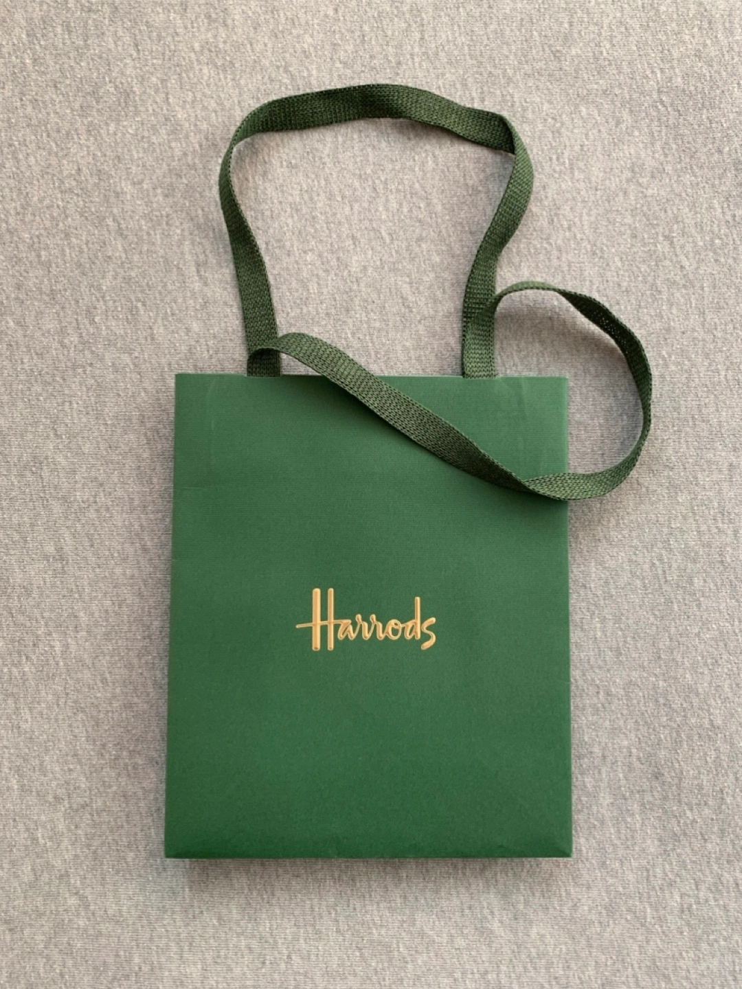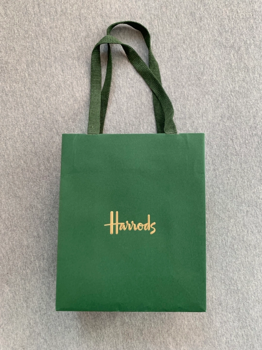Thick paper construction with fabric handle. Selling a Harrods gift bag in their classic green colour with gold monogram. Perfect for small gifts, a collectible or as a reusable shopping bag! Brought back from London last summer with souvenirs in it. Good “used” condition but has been stored since.