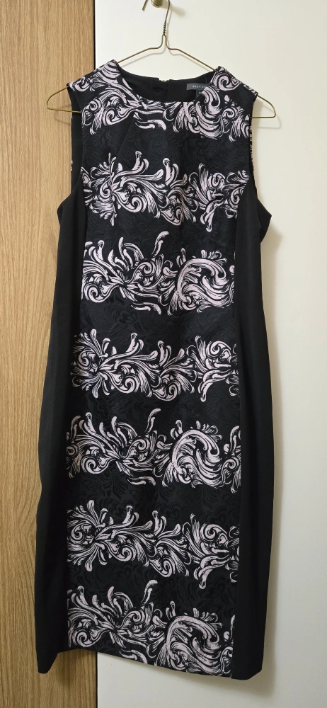 Size: Medium It's black with a white baroque-style pattern on the front. Perfect for an evening out or special occasion!