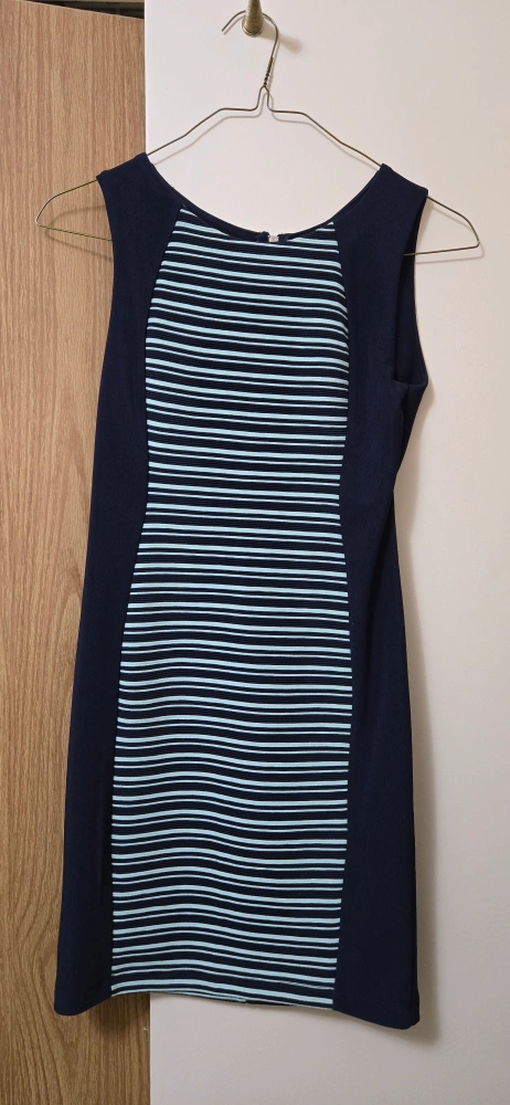 Selling a cute dress with a navy and turquoise striped pattern. It's in great condition and has a zipper in the back. Perfect for a casual day out or a summer party!