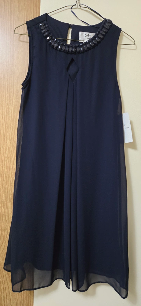 A lovely navy blue dress from SD Collection! It features a jeweled neckline and a flowy design. Perfect for a special occasion or a night out