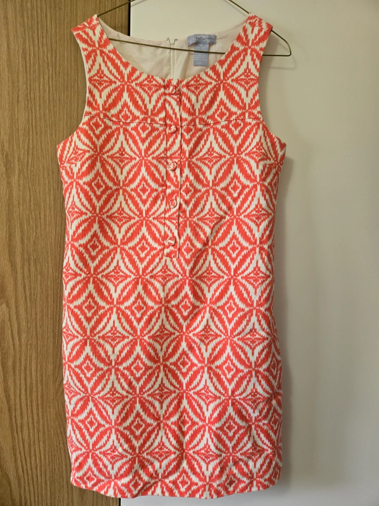 This Joe Fresh dress is in great condition and ready for a new home! The dress is a size L. It features a vibrant coral and white pattern, perfect for adding a pop of colour to your wardrobe. The body is made of 100% cotton, and the lining is 65% polyester and 35% cotton