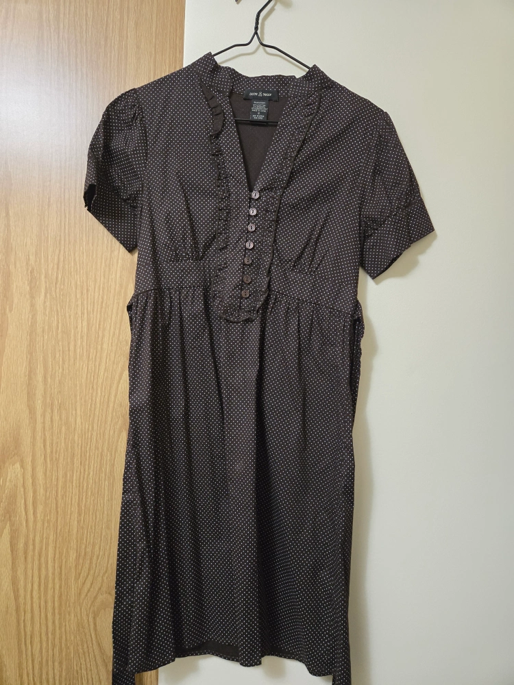 This is a Rock & Republic dress. It features a brown polka dot pattern and short sleeves. Perfect for a casual day out!