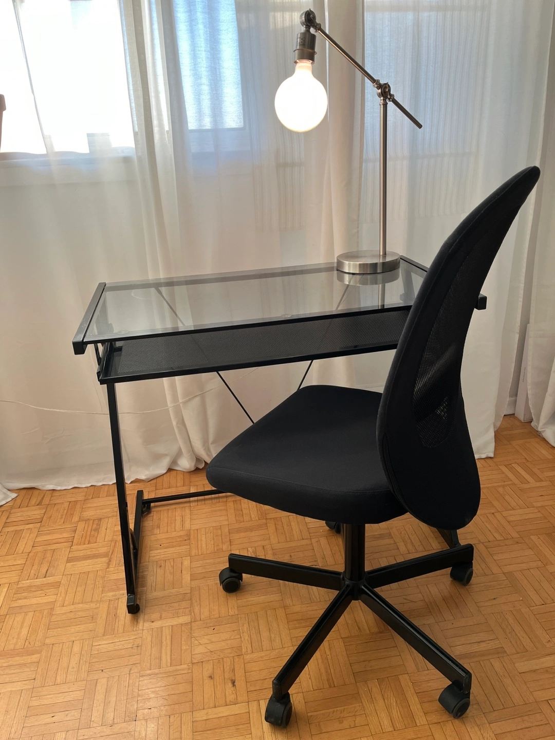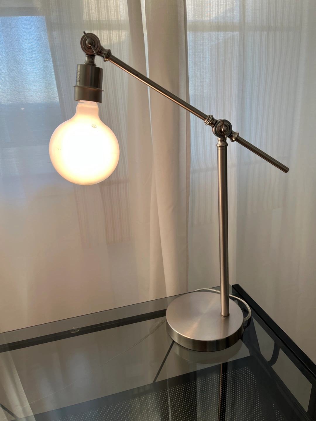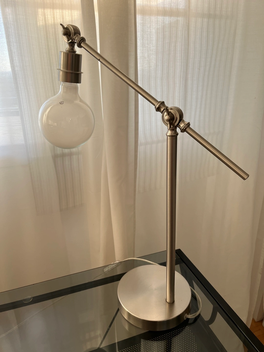 Stylish silver articulating arm desk lamp. It's in great condition and would look great in any room.
