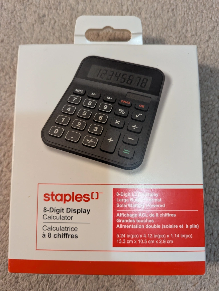 Selling a brand new Staples 8-Digit Display Calculator still in its original box! It features a large button format and is solar/battery powered. The dimensions are 5.24 in x 4.13 in x 1.14 in (13.3 cm x 10.5 cm x 2.9 cm).