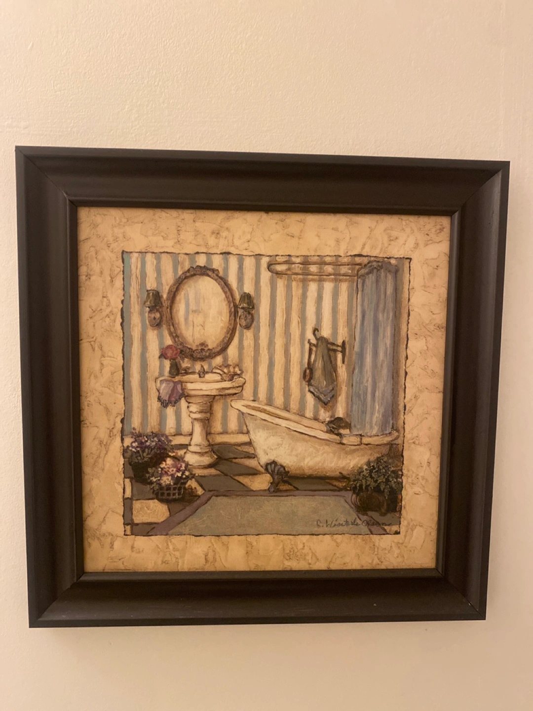 Here's a framed print of a bathroom scene! It's in great condition and would look lovely in a bathroom or powder room