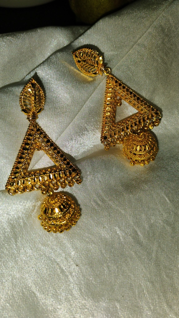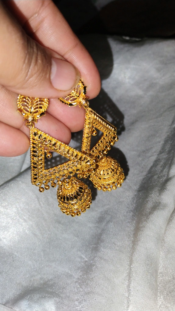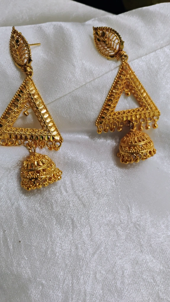 ๐Selling a pair of gold-toned triangle jhumka earrings. These earrings feature a unique triangle design with traditional jhumka bells, perfect for adding a touch of elegance to any outfit. They are in great condition and ready for a new home