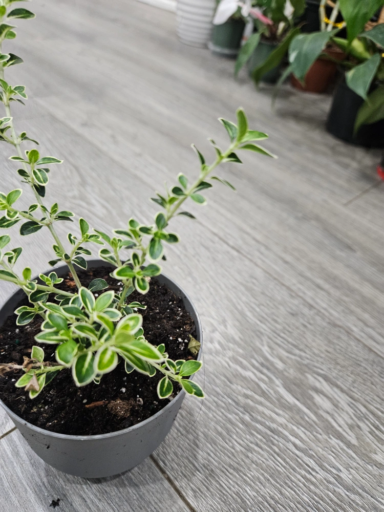 Selling a lovely variegated plant potted in a simple grey pot. It's a beautiful addition to any indoor space and is easy to care for. Perfect for adding a touch of green to your home!