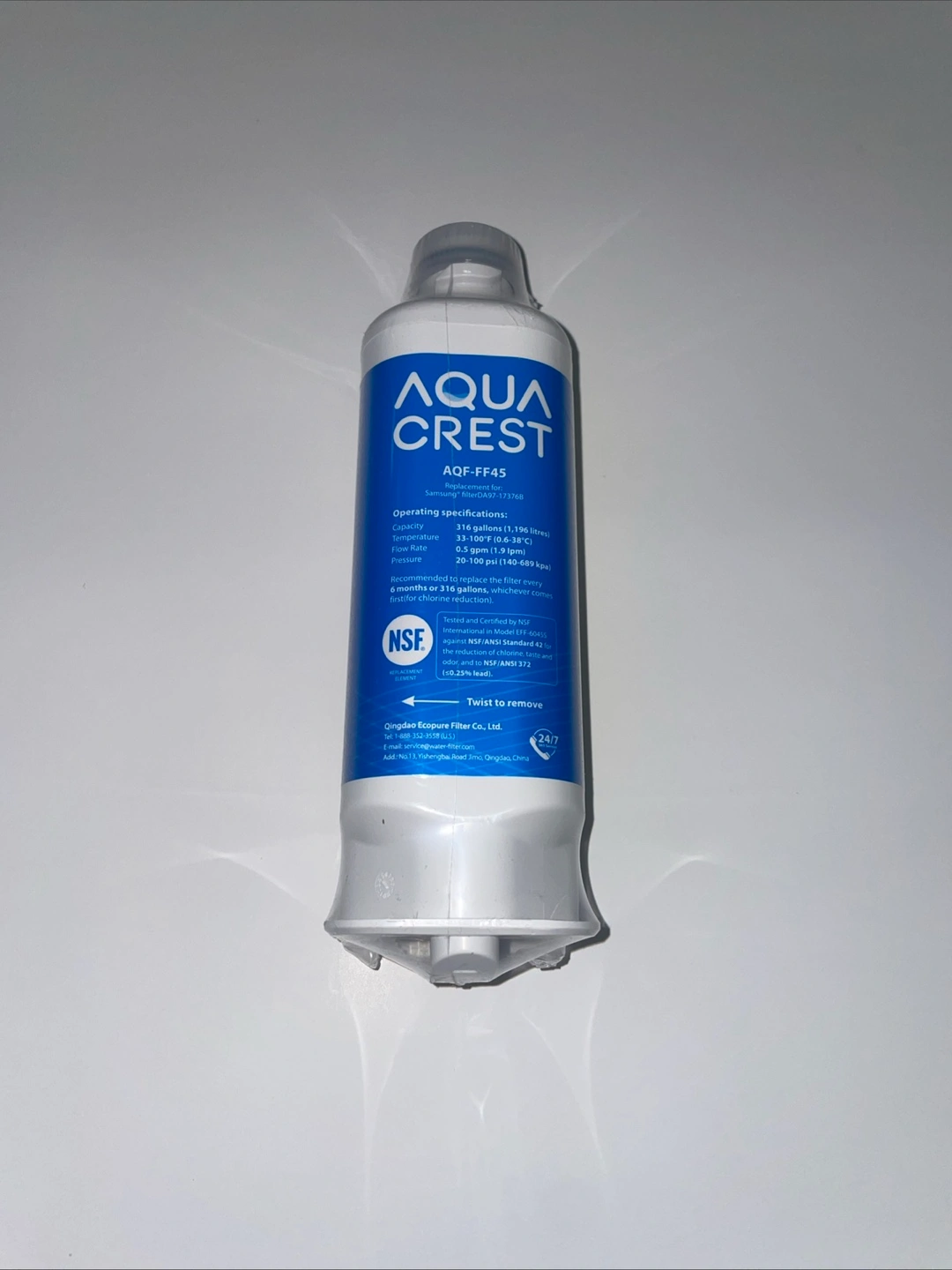 Selling a brand new Aqua Crest AQF-FF45 water filters! These are replacements for Samsung filters, model DA97-173768. They're certified by NSF International against NSF/ANSI Standard 42 for chlorine, taste, and odour reduction, and NSF/ANSI 372 for lead reduction. Operating specifications: - Capacity: 316 gallons (1,196 litres) - Temperature: 33-100°F (0.6-38°C) - Flow Rate: 0.5 gpm (1.9 lpm) - Pressure: 20-100 psi (140-689 kpa) It's recommended to replace the filter every 6 months or 316 gallons, whichever comes first for chlorine reduction 2 filters available for $25