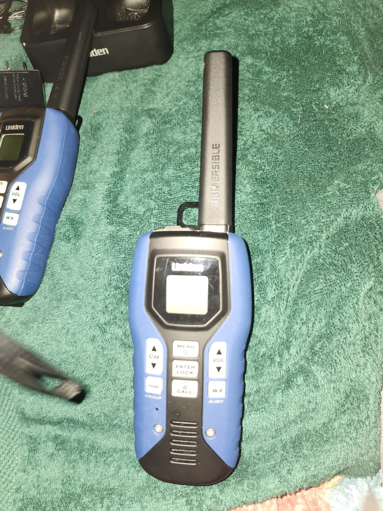 Selling a pair of Uniden GMR2838-2 two-way radios! They're submersible and come with their charger, so you're all set for your next adventure. Perfect for camping, hiking, or any outdoor activity where communication is key