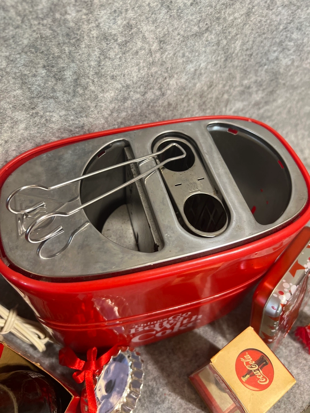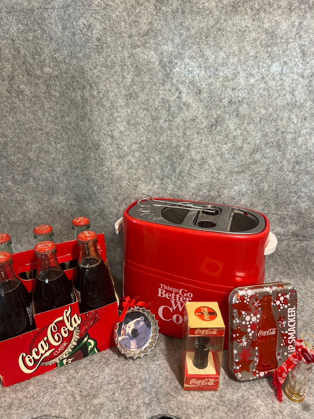 Hot Dogger is new and comes with hard to find tongs. Selling a Coca-Cola collectibles lot! Includes a six-pack of Coca-Cola bottles, a Coca-Cola hot dog cooker, a polar bear ornament, a Coca-Cola Lip Smacker tin, and a Coca-Cola bottle in a box