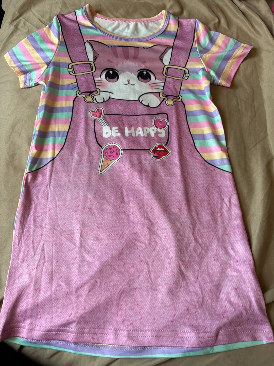 Adorable dress with a cute cat design! The size is 4-5Y. Features a colourful striped top and a pink overall-style bottom with a 'Be Happy' print. Perfect for your little one! Only available for pick up.