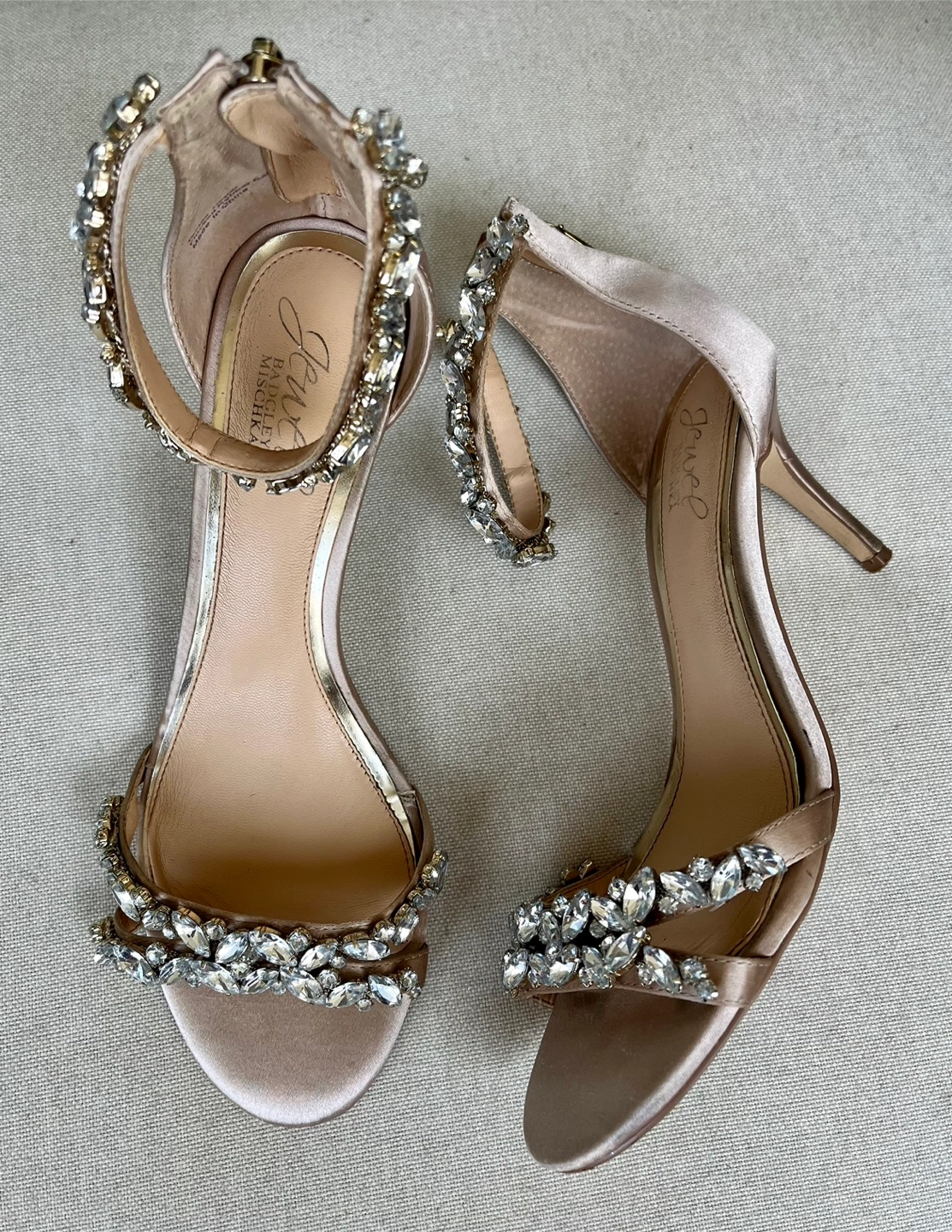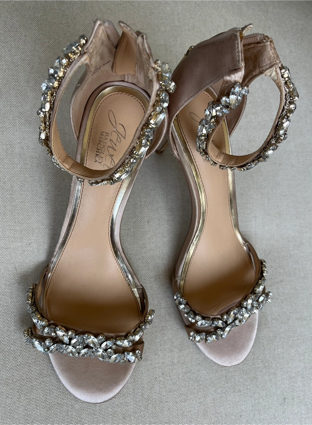 Jewel Badgley Mischka heels in a beautiful neutral tone with delicate crystal embellishments that add a touch of elegance Great for a wedding or night out Women Size 7.5 Pick up Bloor and Islington Etobicoke